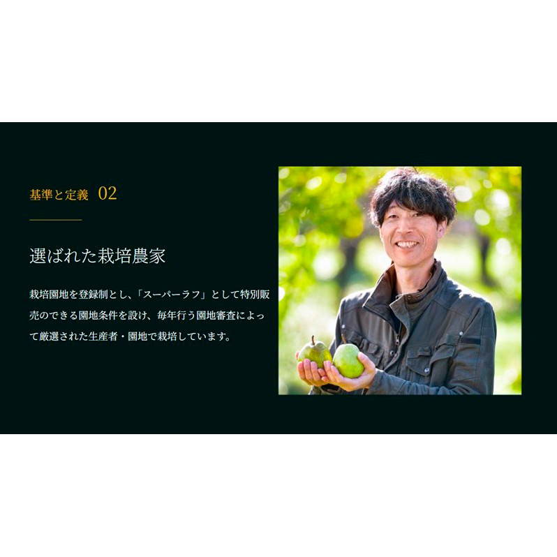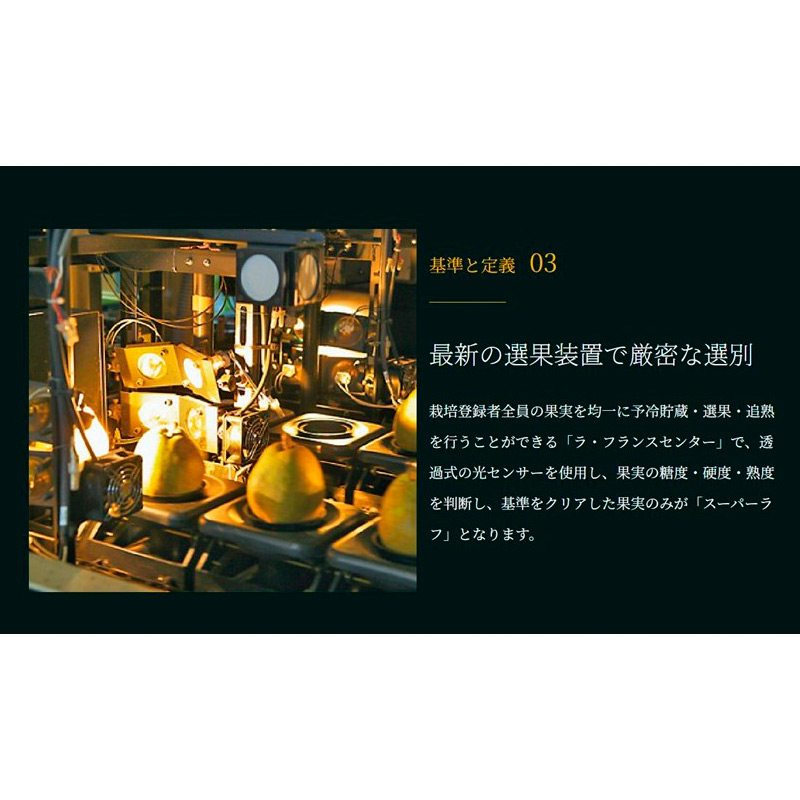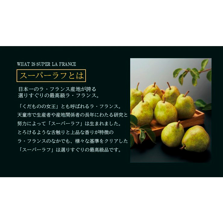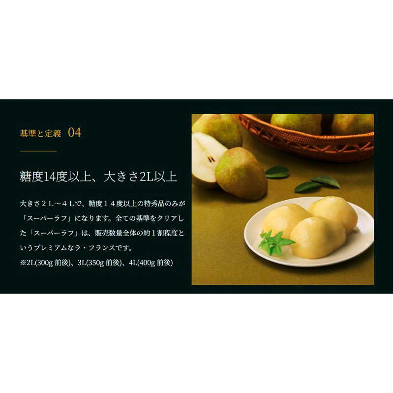 「くだものの女王」とも呼ばれるラ・フランス。とろけるような舌触りと上品な香りが特徴のラ・フランスのなかでも、様々な基準をクリアした「スーパーラフ」は選りすぐりの最高級品です。選ばれた栽培農家が土づくりからこだわり、最新の選果装置で糖度14度以上、2Lサイズ以上の基準をクリアした特秀品が「スーパーラフ」になります。