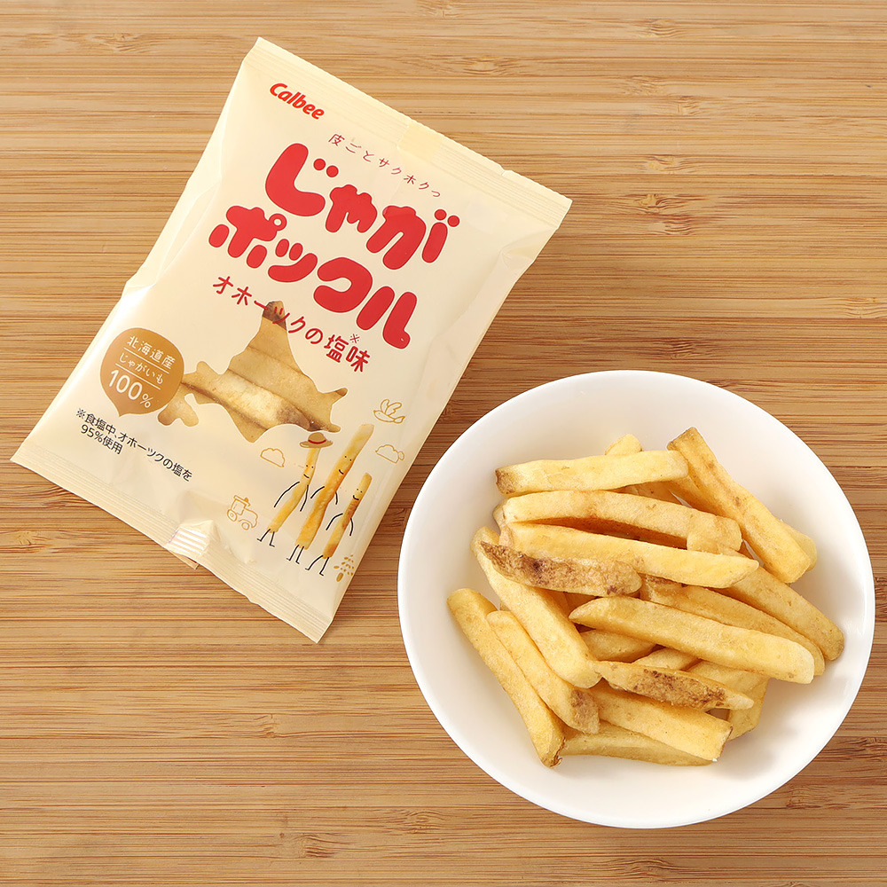 北海道産のじゃがいもの中でも製法に適した大きさのものを選別し、うま味を残すために皮付きのまま、まるごとカット。サクサクッとくる食感とオホーツクの塩で、北海道じゃがいも本来の味わいを生み出しています。