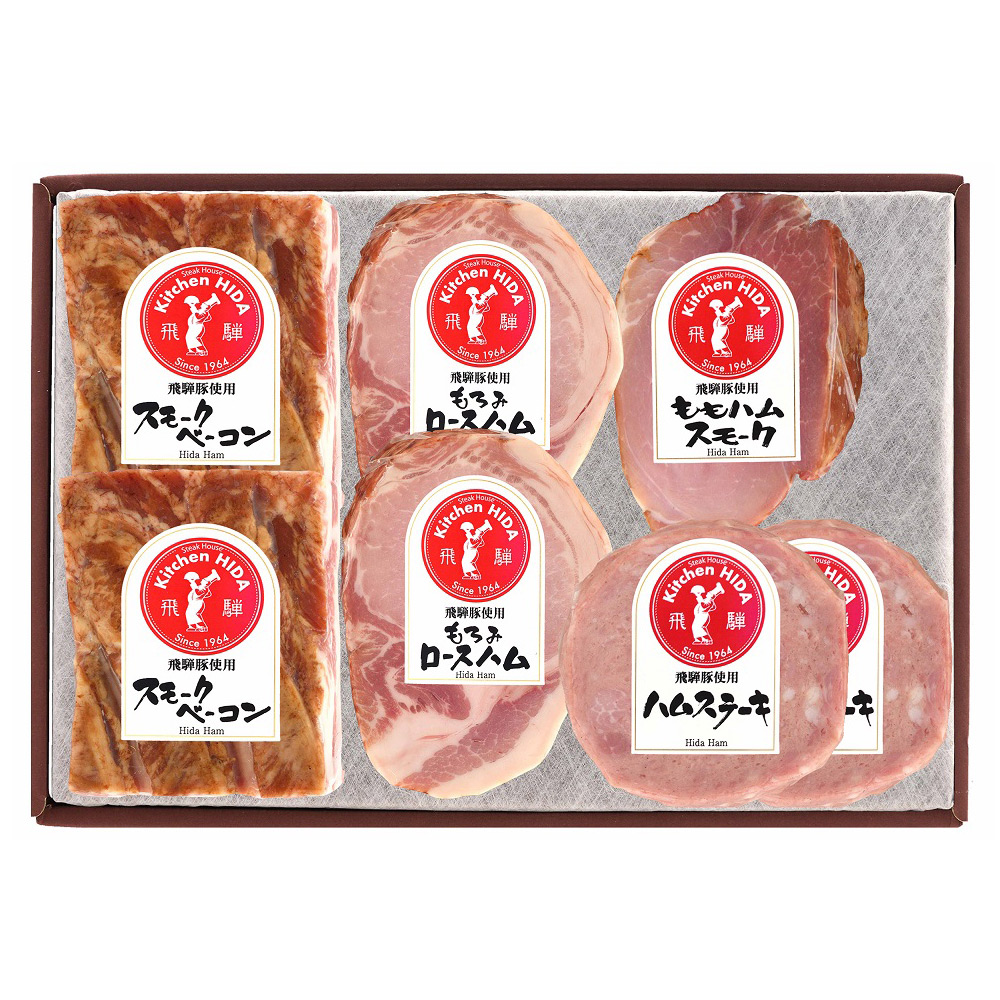 しょうゆもろみを加えたキッチン飛騨特製の漬込液でゆっくりと漬け込み山桜の原木でじっくりとスモークした3種類のハム、ノンスモークでさっぱりとした味わいのハムステーキの詰め合わせです。