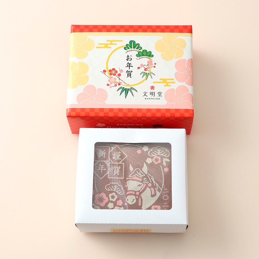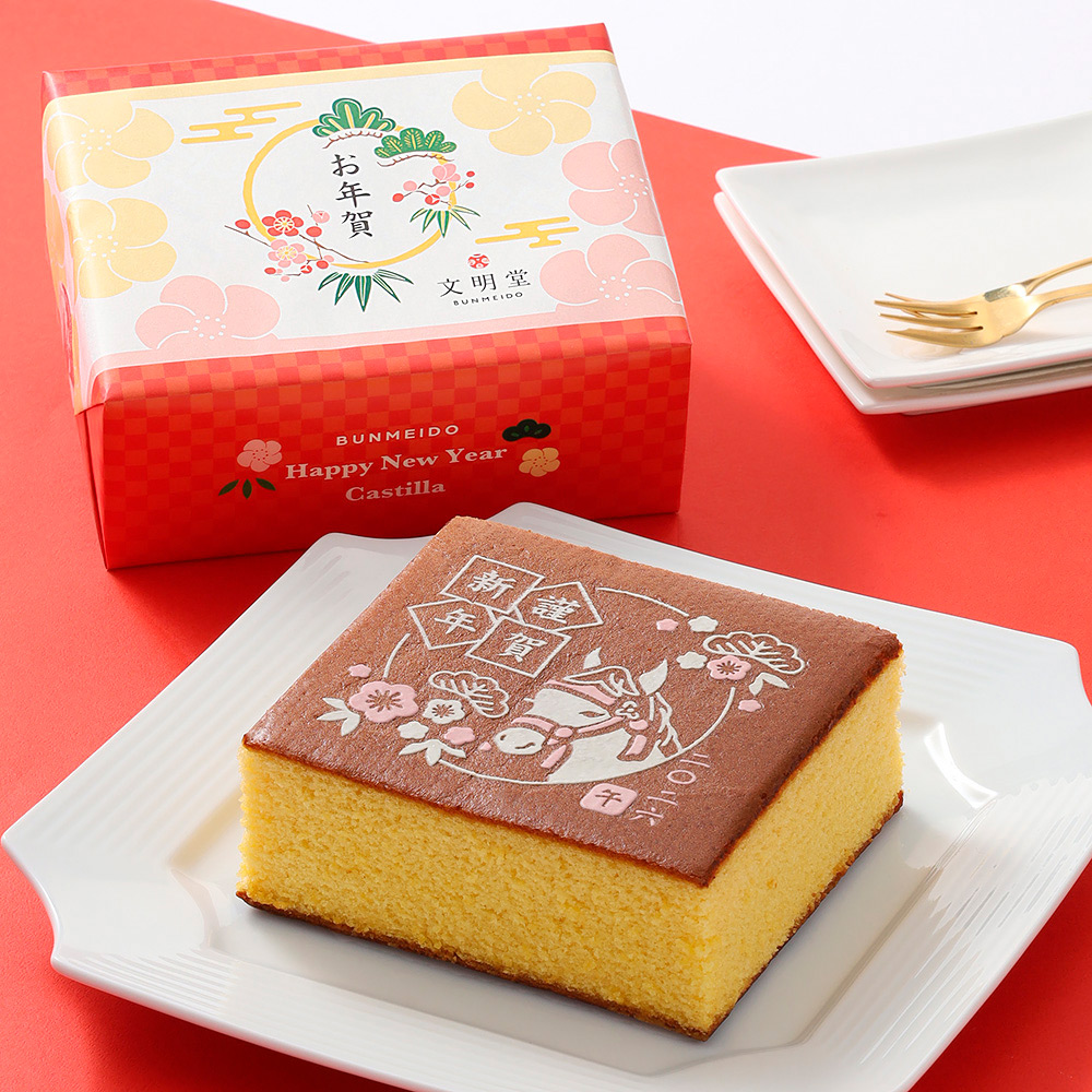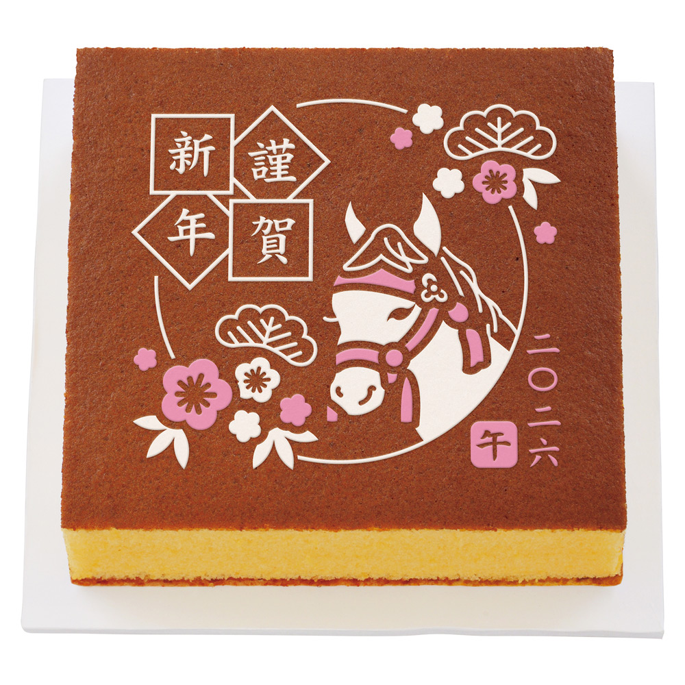 「小麦粉・卵・砂糖・水あめ」 のみを使ってしっとりまろやかに焼き上げました。2026年午年のデザインを描いたお年賀カステラです。