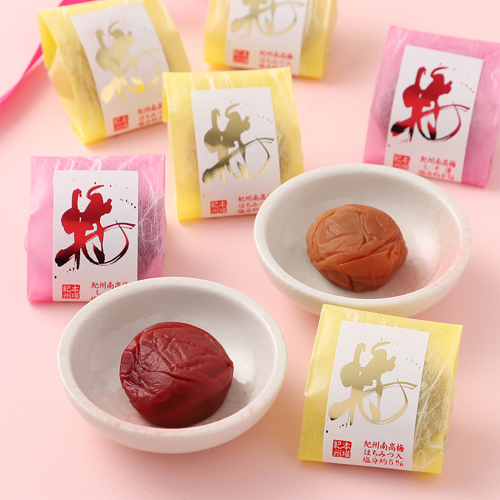 国産はちみつを使用した上品な甘みを持つ梅干と、しそ風味で仕上げたマイルドな減塩味梅干を個包装にしました。