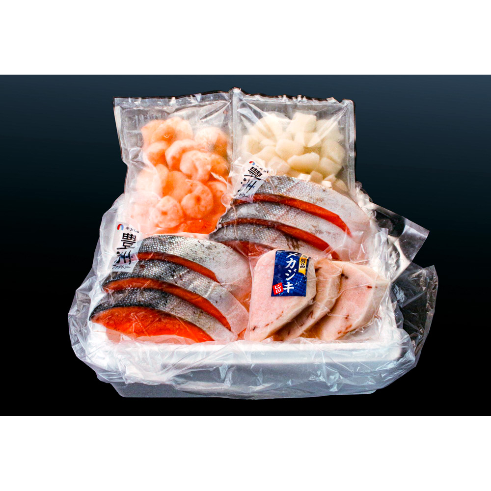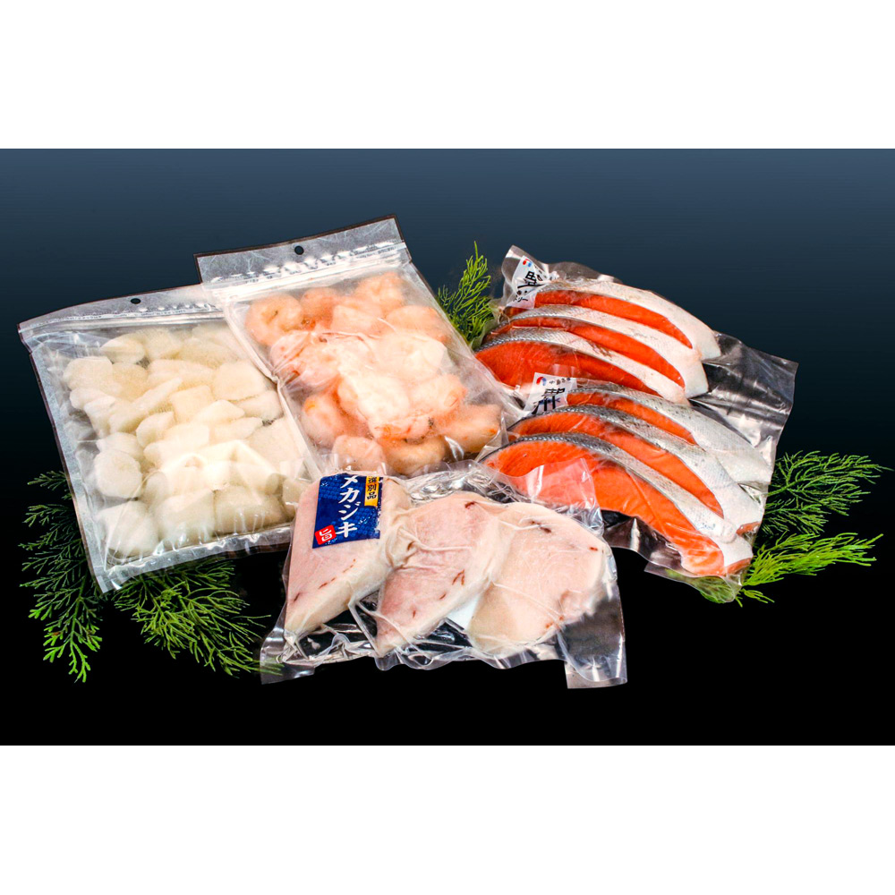 サーモントラウト切身3切パック×2、めかじき切身3切パック×1、むきえび240gパック×1、いか切り落とし250gパック×1