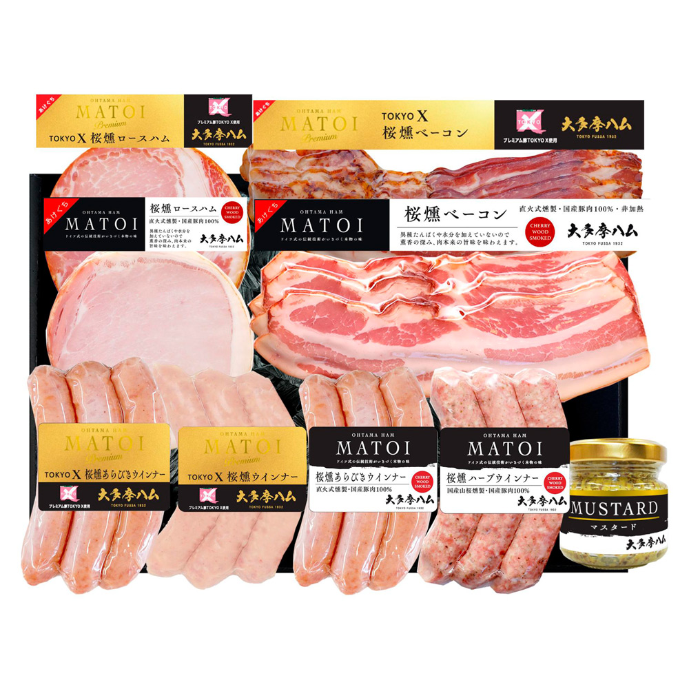 銘柄豚TOKYO Xを使用したMATOIプレミアムシリーズと、山桜燻製にこだわったMATOIシリーズを食べ比べできる詰合せ。TOKYO Xは東京都青梅市発祥のブランド豚。霜降りが多い肉質で、甘みのあるさらっとした脂が特徴です。大多摩ハムオリジナルの粒マスタード入り。