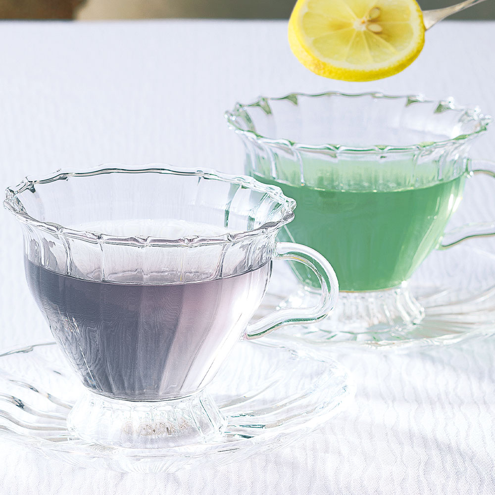 レモン果汁を加えると、鮮やかなブルー(緑)から紫色へと変化。レモングラスをベースにバタフライピーとミントを調合した爽やかな風味です。※PHと水の硬度によって色が変化します。色の変化を楽しむ際は、加える成分の性質と水の種類をご確認ください。