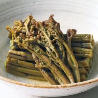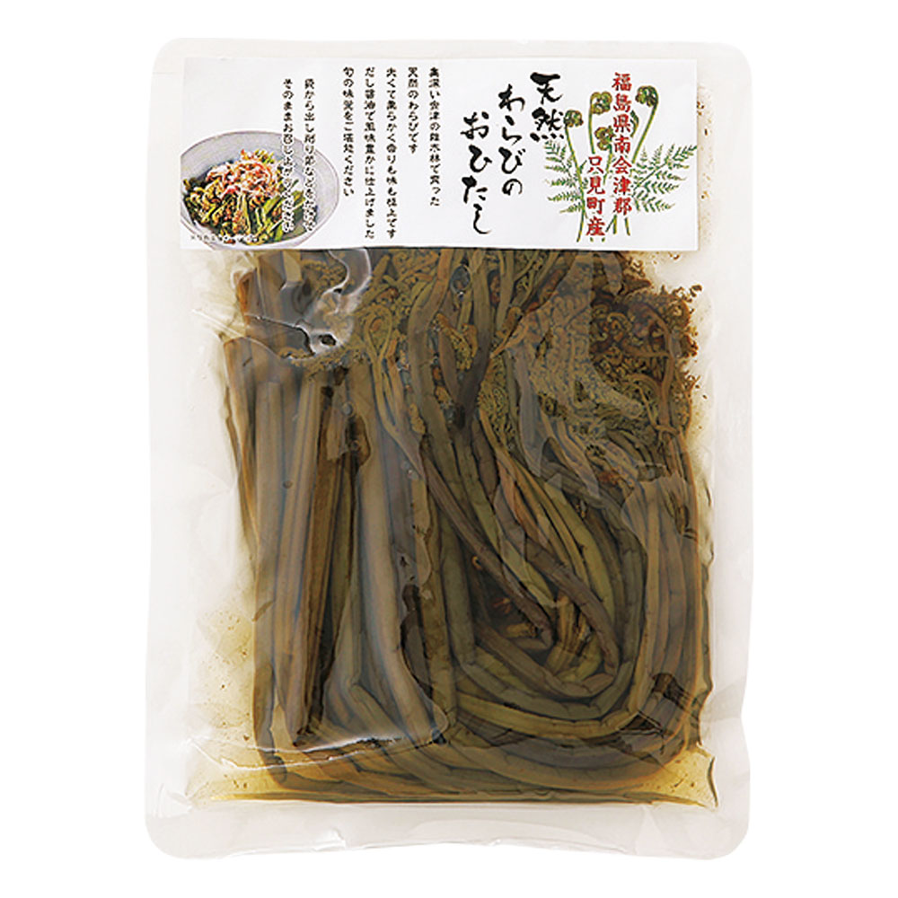 奥深い会津の雑木林で育った天然のわらびを使用。だし醤油で風味豊かに仕上げた、太くてやわらかいわらびのおひたしです。