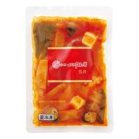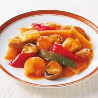 しっかりと下味を付けたえびといかを、筍やふくろたけなどと一緒に炒めました。四川風の辣油と酢で甘辛く仕上げています。