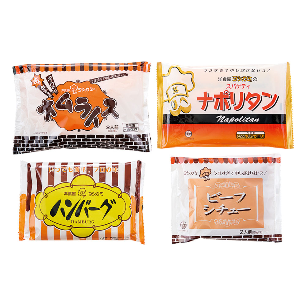 昭和26年創業〈洋食屋ヨシカミ〉監修の洋食メニュー。人気のオムライス、ナポリタン、ハンバーグ、ビーフシチューの4種セットです。