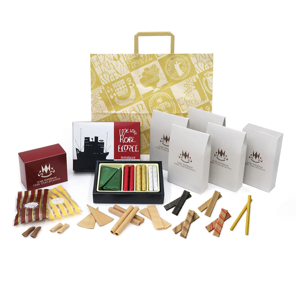 神戸エコルセ8包、黒胡麻エコルセ10枚、紅茶エコルセ10枚、ミルクチョコレートエコルセ10枚、ストロベリーエコルセ10枚、エコリーナ(ミルクチョコ30g、ホワイトチョコ30g)、バトンショコラ瀬戸内レモン6包