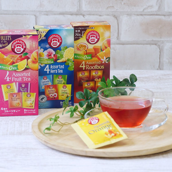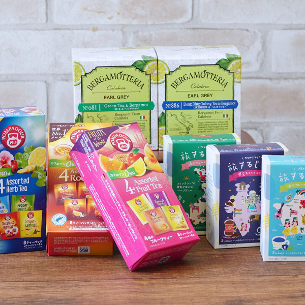 ポンパドール4アソート ハーブティー(4種×各2袋)、ポンパドール4アソート フルーツティー(4種×各2袋)、ポンパドール4アソート ルイボスティー(4種×各2袋)、BERGAMOTTERIA アールグレイ No886凍頂烏龍&ベルガモット(1.5g×10袋)、BERGAMOTTERIA アールグレイ No081緑茶&ベルガモット(1.6g×10袋)、旅するじかん 森のベリーハーブティー(1.5g×5袋)、旅するじかん 海のブルーハーブティー(1.5g×5袋)、旅するじかん 夢見るスパイスティー(2g×5袋)