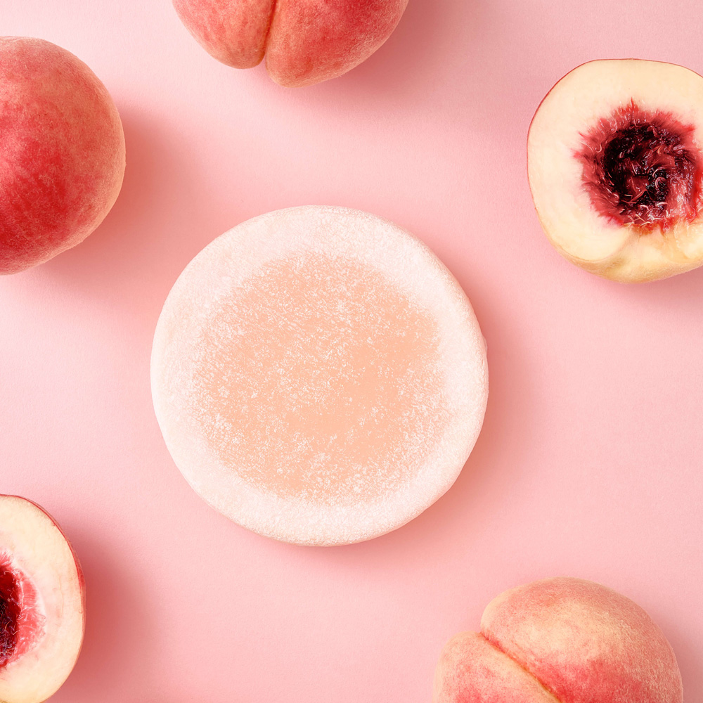 人気の「雪」シリーズに桃が新登場。オーストラリア産クリームチーズとフロマージュブランを使用したチーズムースの中に、甘くやわらかな恋香桃を閉じ込め、桃のソースを敷いてから求肥で優しく包み込みました。チーズムースの爽やかな酸味と桃の優しい甘み、求肥のもちもち感が織りなすハーモニーが口いっぱいに広がります。
