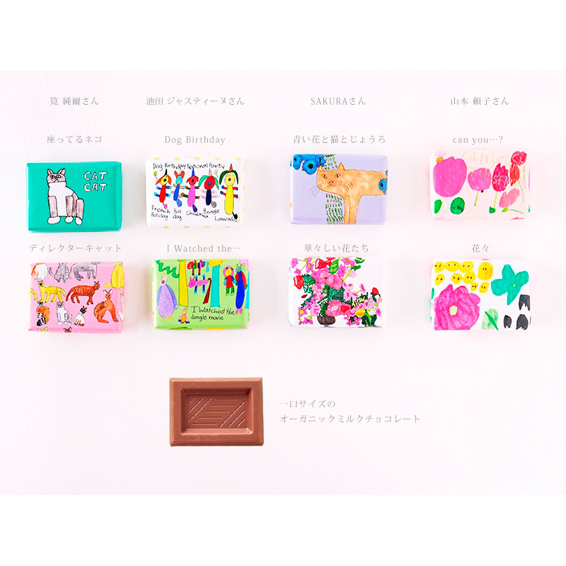 第3世界ショップの大人気フレーバーのミルクチョコレートは、ヘーゼルナッツパウダーを練りこんだ、リッチで口どけのよいチョコレートです。ナッツの香ばしい風味がミルクの濃厚な甘みを引き立てます。白砂糖は使用せず、粗糖と黒糖を使用。有機栽培で育てられた原材料を使用したチョコレートです。カカオ分約38%。チョコレートのアートワークは、様々な障がいを持つ人が好きなこと・得意なことで活躍し、 嬉々として創造的に暮らせる社会を目指して活動する福祉施設・アトリエ 「嬉々 CREATIVE(キキ・クリエイティブ)」の個性的なアーティスト4名によるデザイン。個包装のチョコレートは、お配りギフトにもピッタリです。