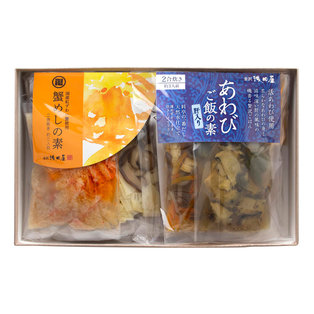 慶応3年創業、金沢を代表する料亭旅館「浅田屋」。活あわびの柔らかな身と滋味深い肝の風味をお楽しみいただけるよう、昆布だしにあわびや天日塩を合わせただしで炊き上げる「あわびご飯の素」、国産紅ずわいがにの身を鰹と昆布だしで香ばしく炊き上げる「蟹めしの素」を詰合せしました。お祝いの席の一品にもおすすめです。