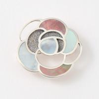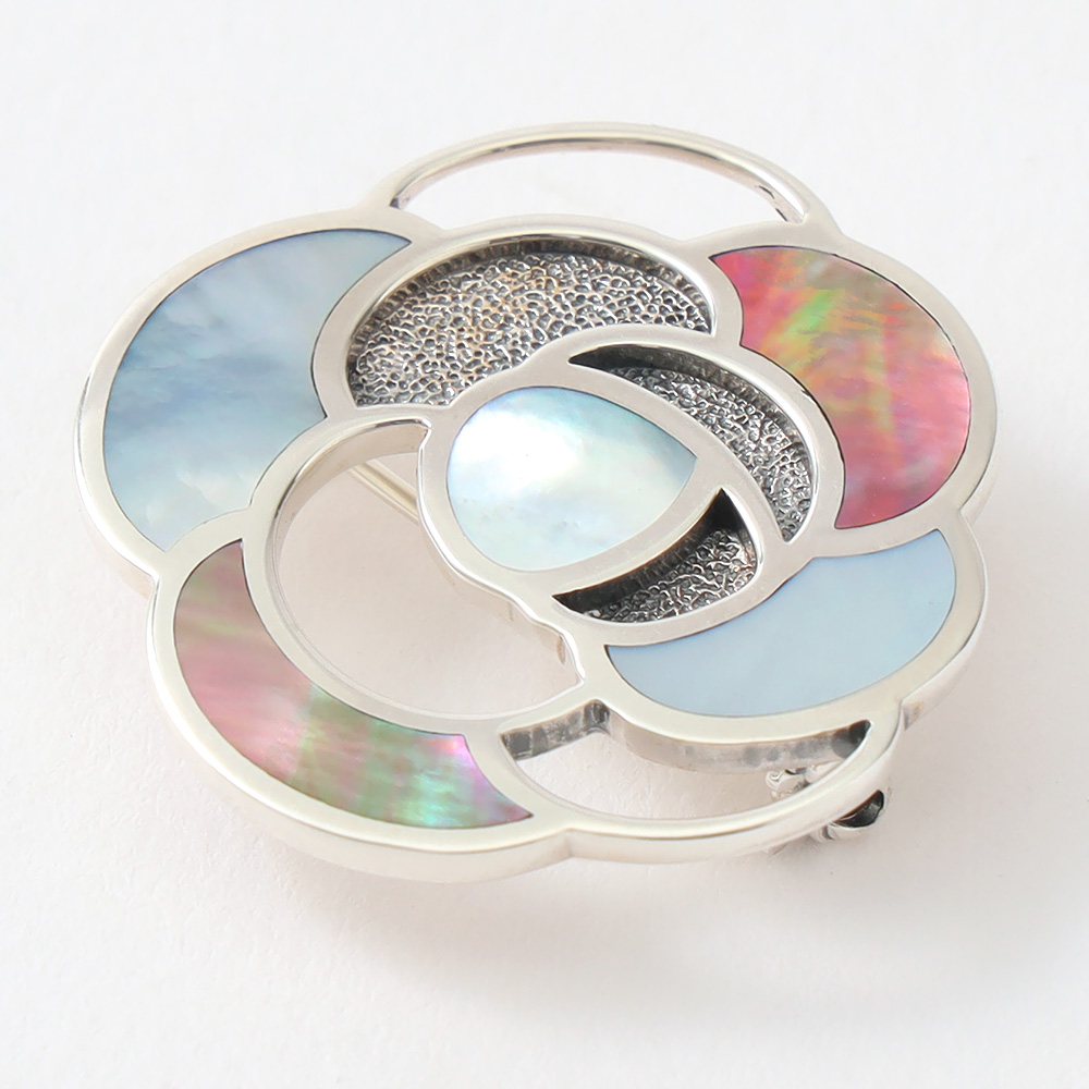 カメリアの花びらをモチーフに白蝶貝と黒蝶貝をはめ込んだブローチ