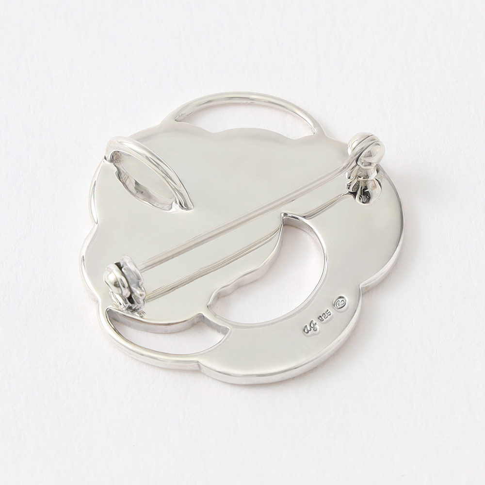 カメリアの花びらに白蝶貝と黒蝶貝をはめ込んだペンダント兼用ブローチ。枠に合わせてシェルをカットするため大変手間が掛かっています。白蝶貝と黒蝶貝は白蝶真珠と黒蝶真珠の母貝のため、角度によって光が揺らめく独特の光沢や艶があります。透かしの花びらやシルバーのテクスチャーを入れた花びらで軽やかな印象。フラットなデザインがすっきりしていながら立体感を感じさせます。無地の洋服にはもちろん、幾何学模様などにもなじみます。黒の洋服にお着けになると、透かし部分から黒がのぞいてモノトーンのグラデーションが出来上がります。ペンダントトップ兼用ですので、お手持ちのチェーンを通せばペンダントとしてもお使いいただけます。