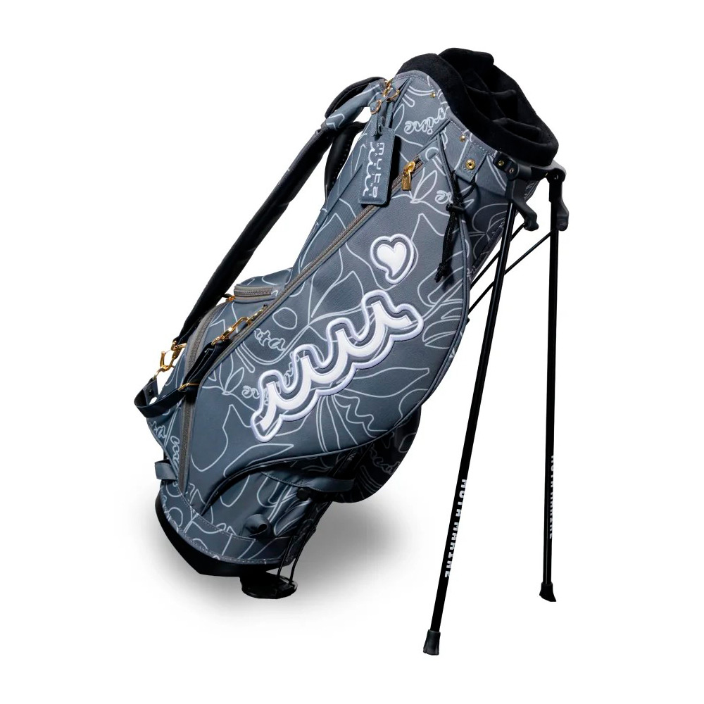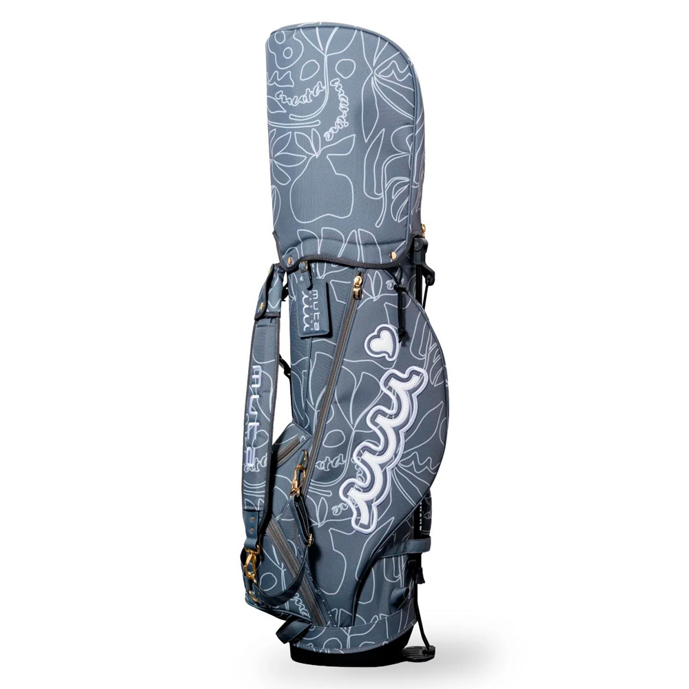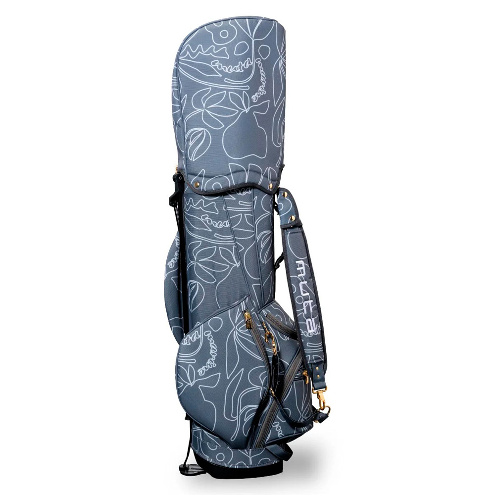 オリジナルのフローラル柄を落とし込んだ総柄をシックな雰囲気に仕上げたスタンドキャディバッグ。丈夫で扱いやすいポリエステル生地を採用。6分割に仕切られた口枠でスムーズな出し入れとバランスのとれたクラブ収納が可能。ボールや小物収納に便利なオープンポケットやジップポケット、側面の収納スペースも広く、デザインだけでなく機能性も十分。
