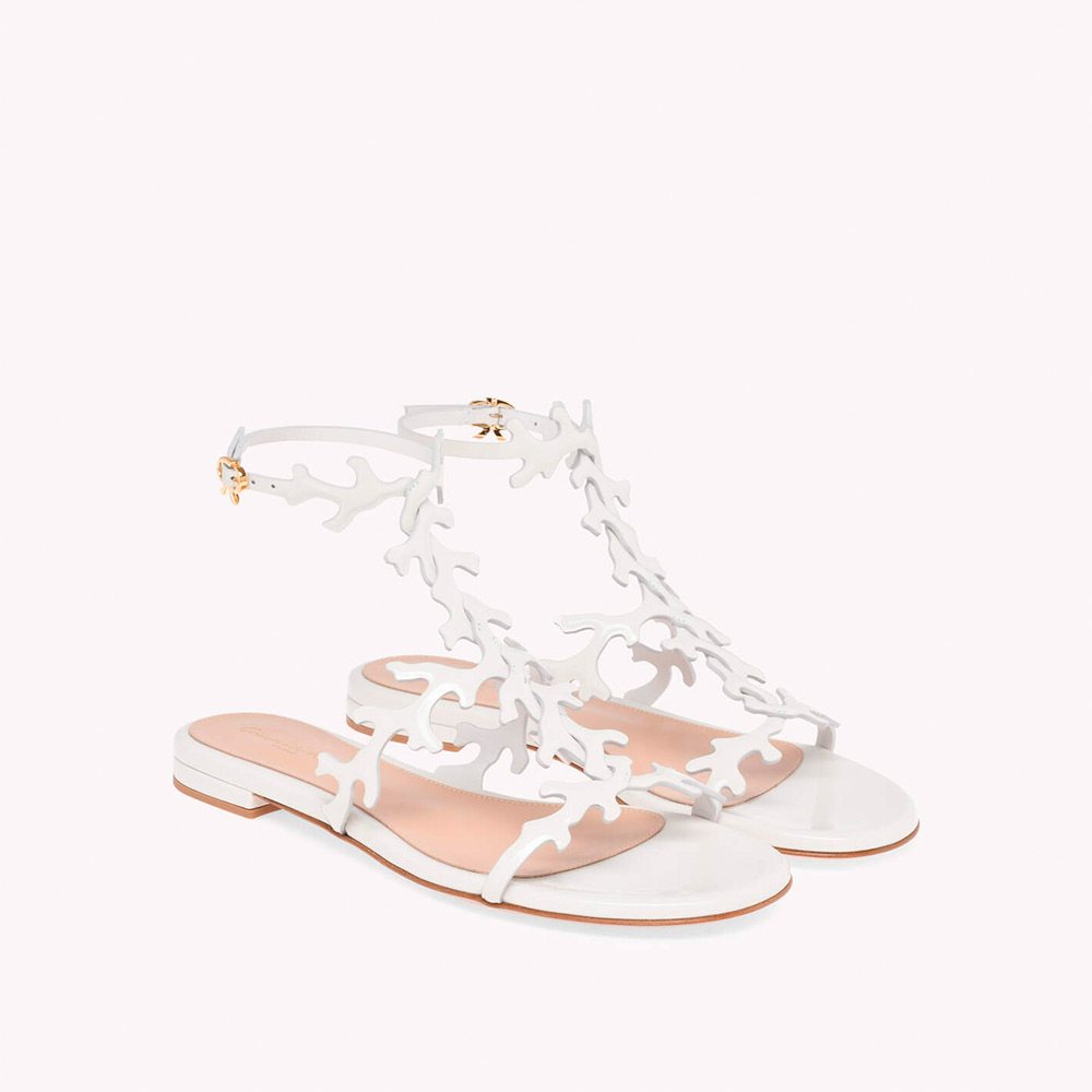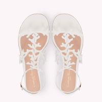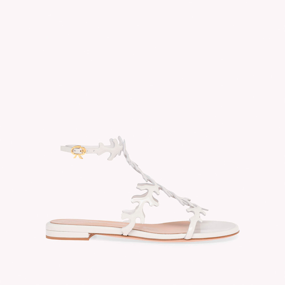 メゾンの特徴である柔らかく光沢のあるNUIレザーを使用し、レーザーカットのコーラルモチーフが特徴のラウンドトゥサンダルです。