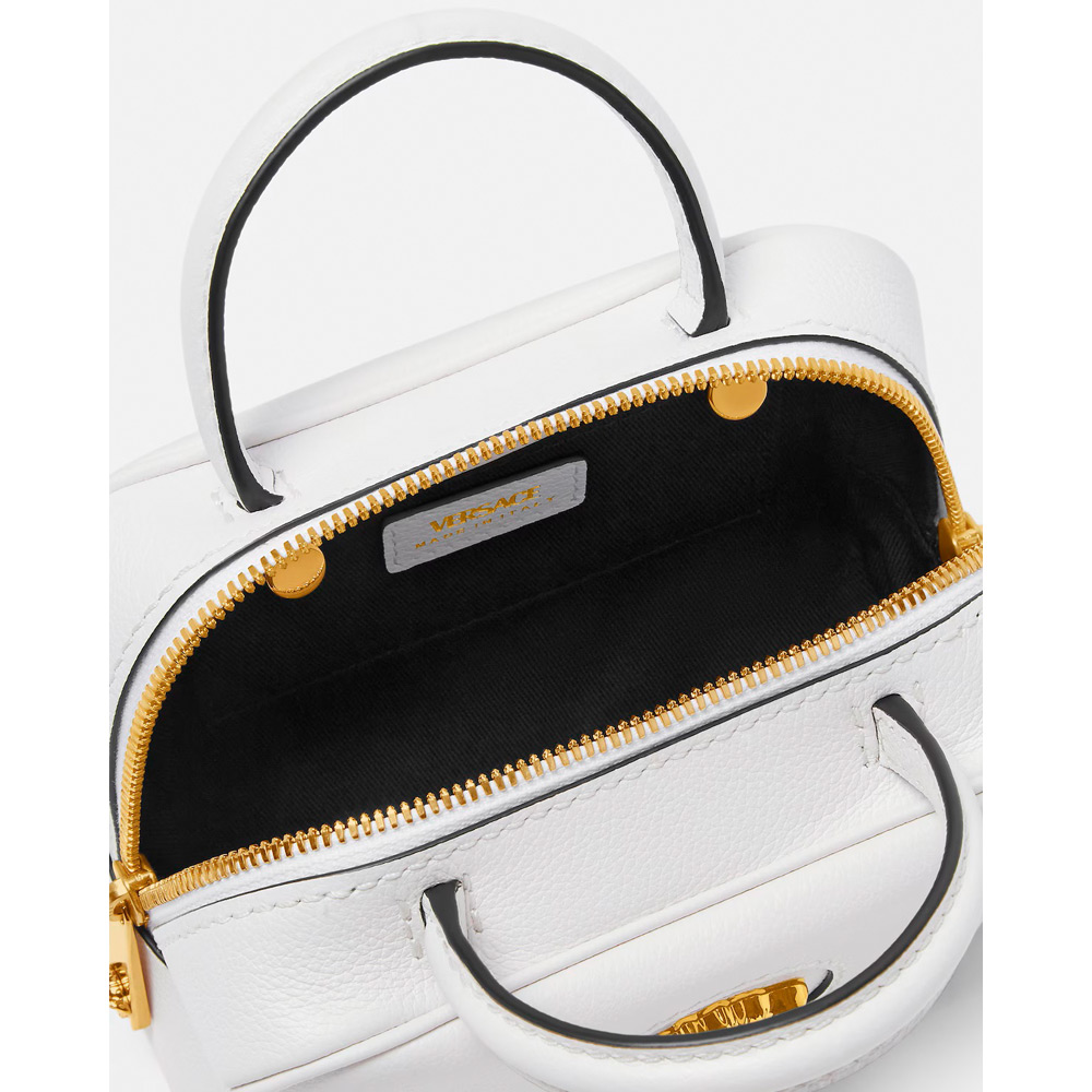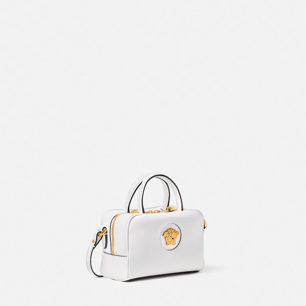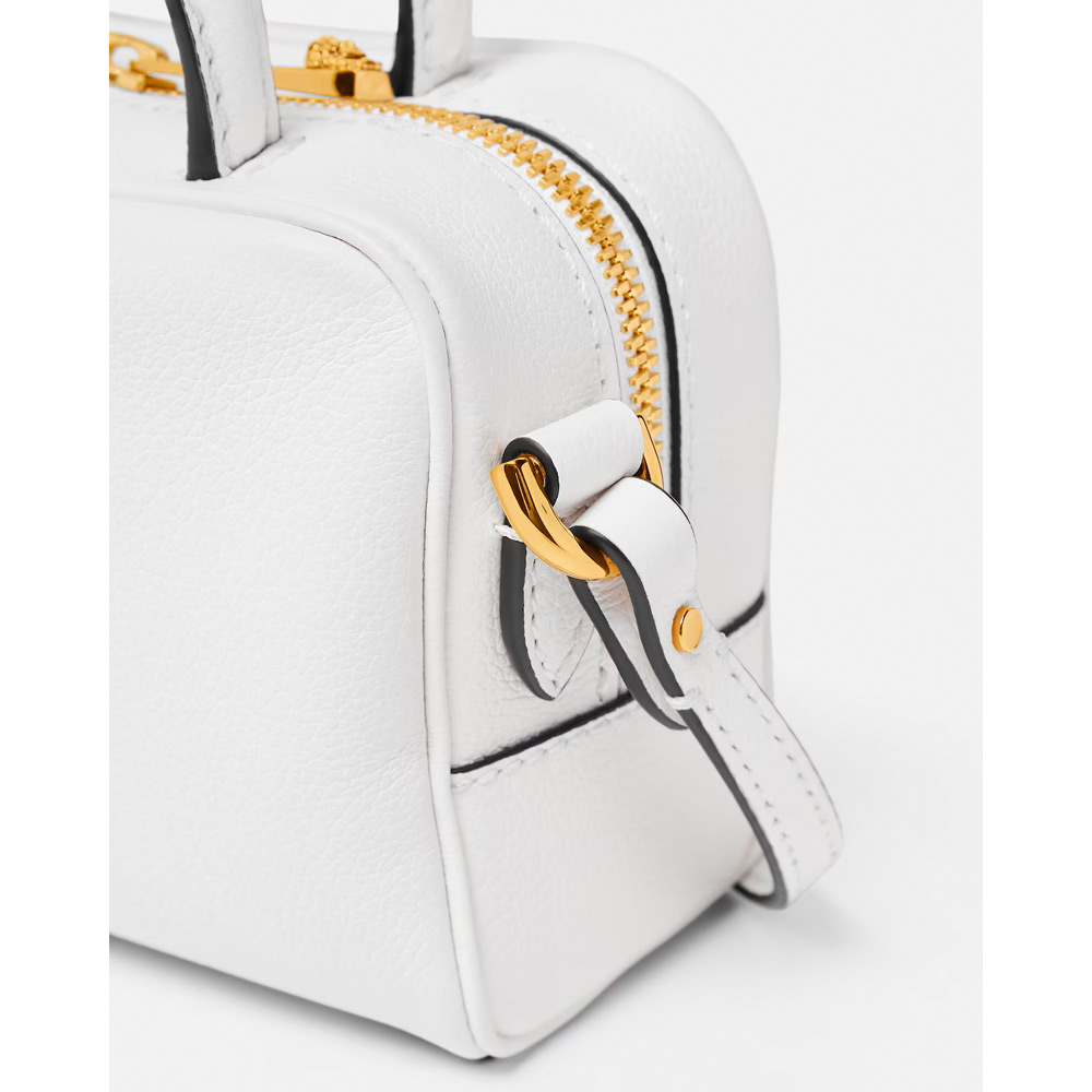 グレインカーフレザーから丹念に作り上げた、ミニボストンバッグ。シグネチャーとして愛される立体的なラメドゥーサハードウェアと、円形トップハンドルが魅力。取り外し可能なレザーショルダーストラップで手に持ったり、クロスボディバッグとして使ったりと、様々なスタイリングを楽しめるデザイン。