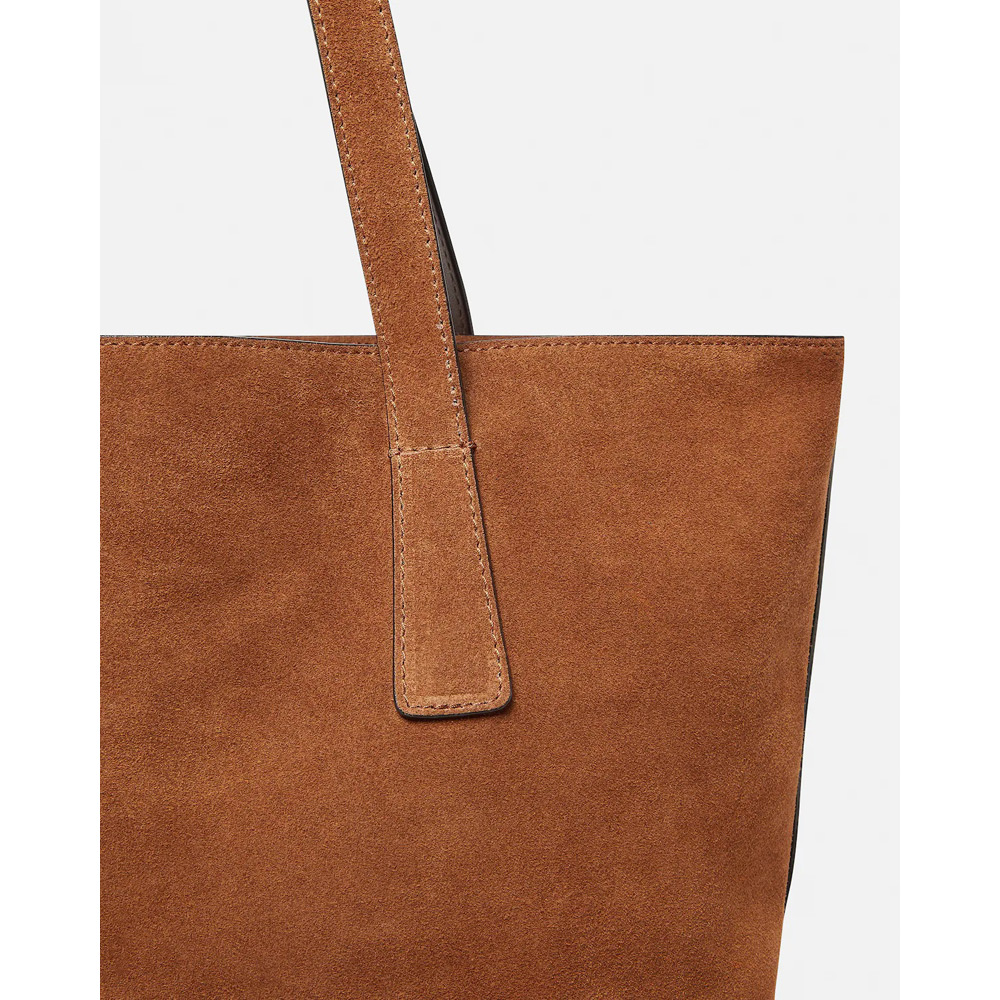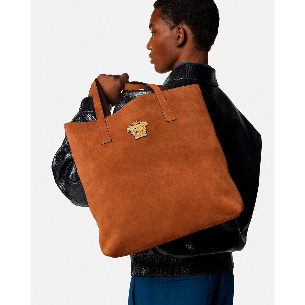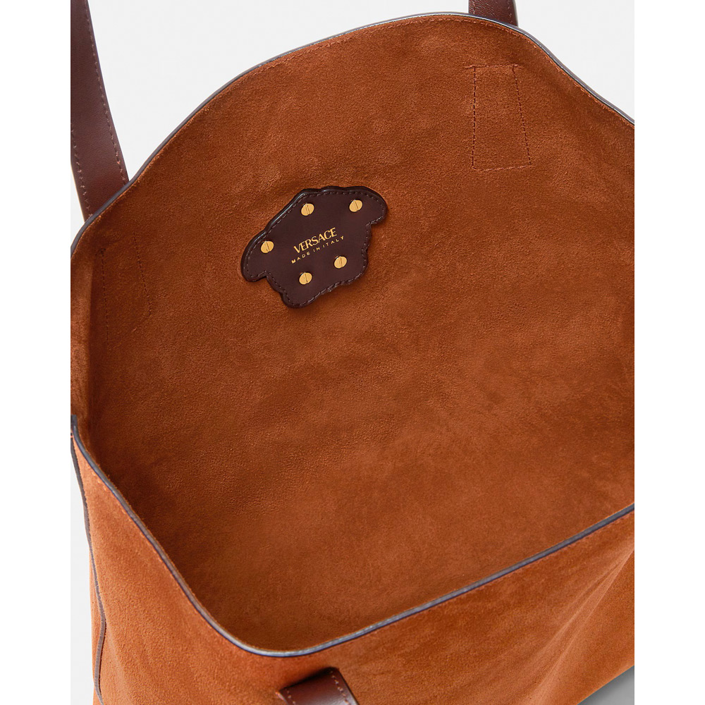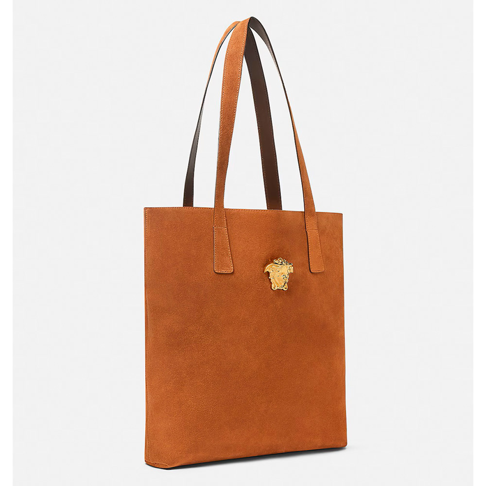 全体をスエードで仕上げたトートバッグ。中央には立体的なラメドゥーサハードウェアのアクセント。