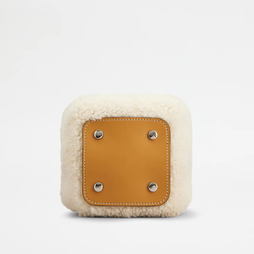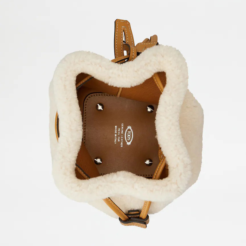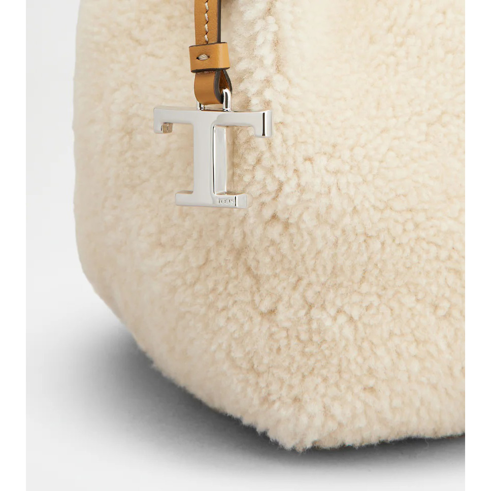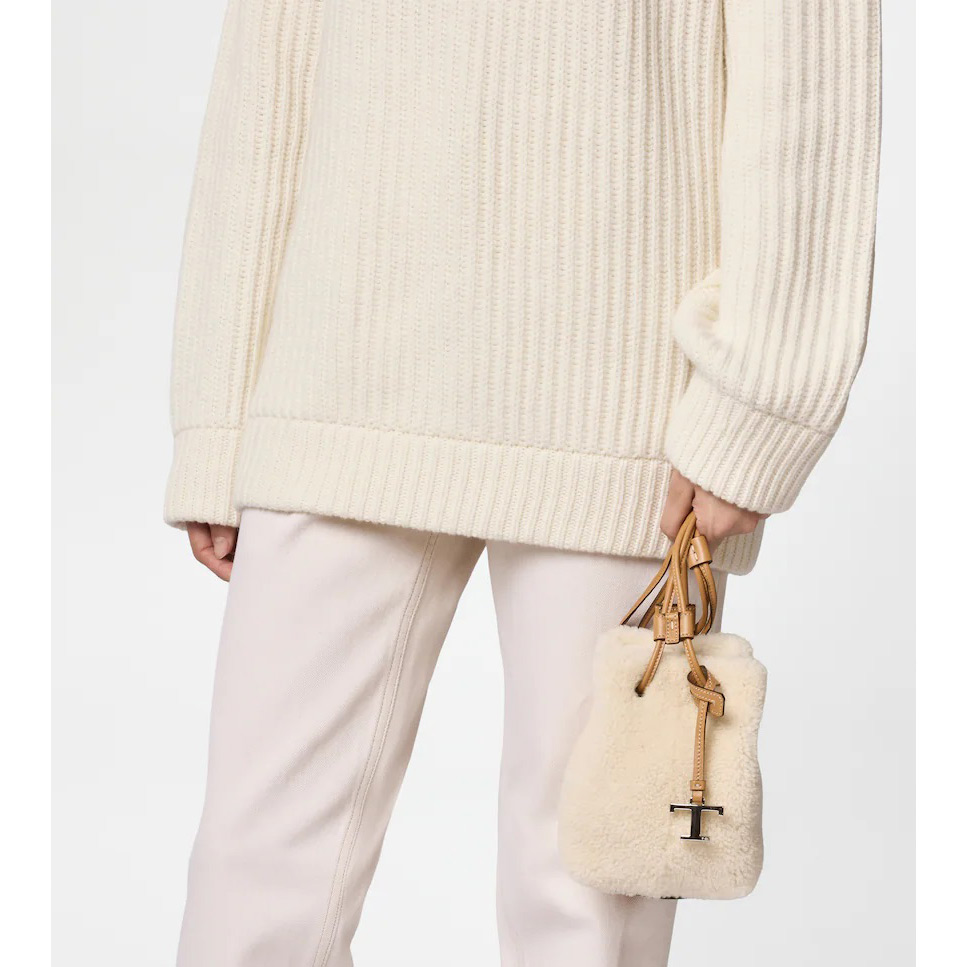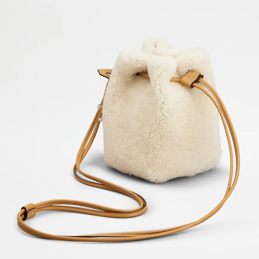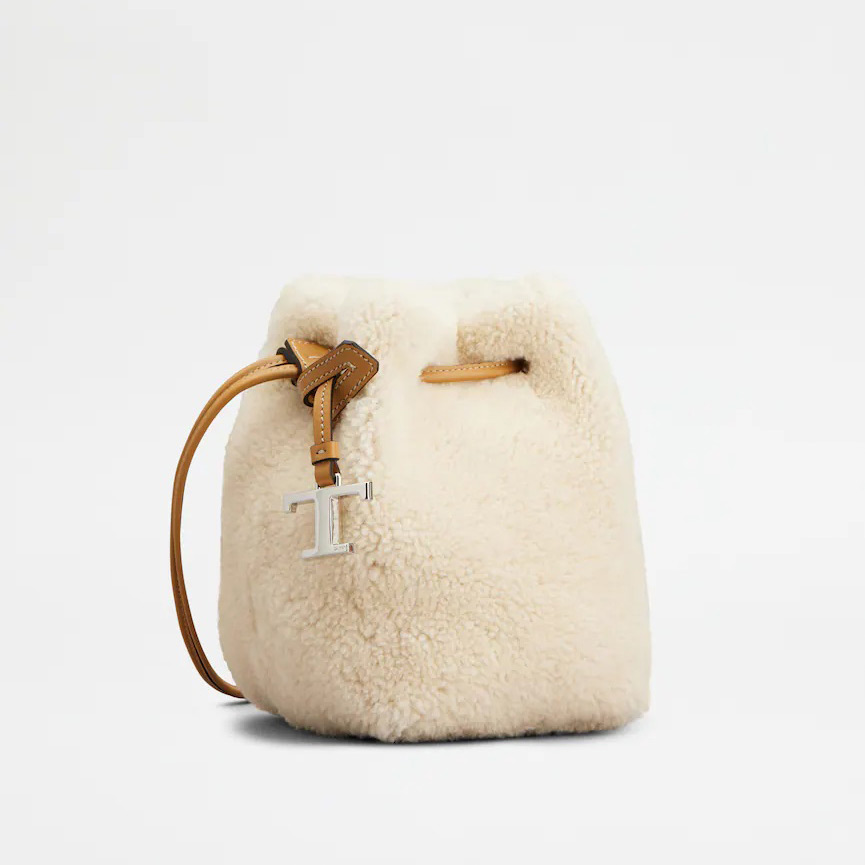ソフトなシアリングのマイクロ バケットバッグ。アイコニックな T タイムレス ペンダント、ドローストリングになるチューブ状のレザーショルダーストラップを合わせた、上品でオールラウンドなウィンターモデルです。