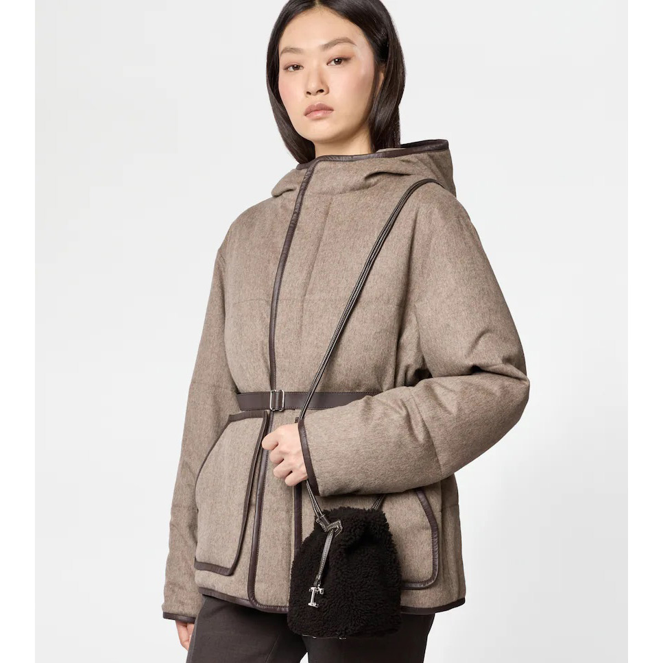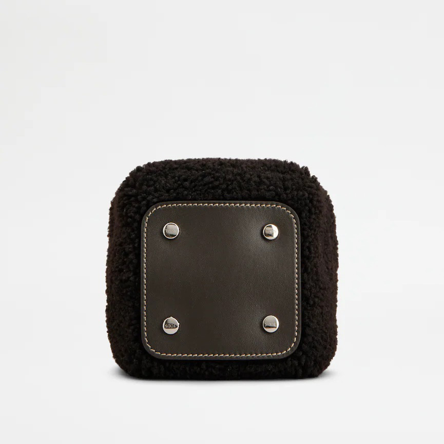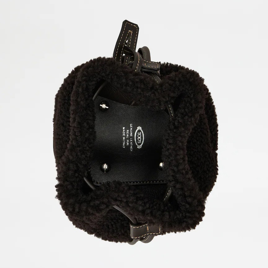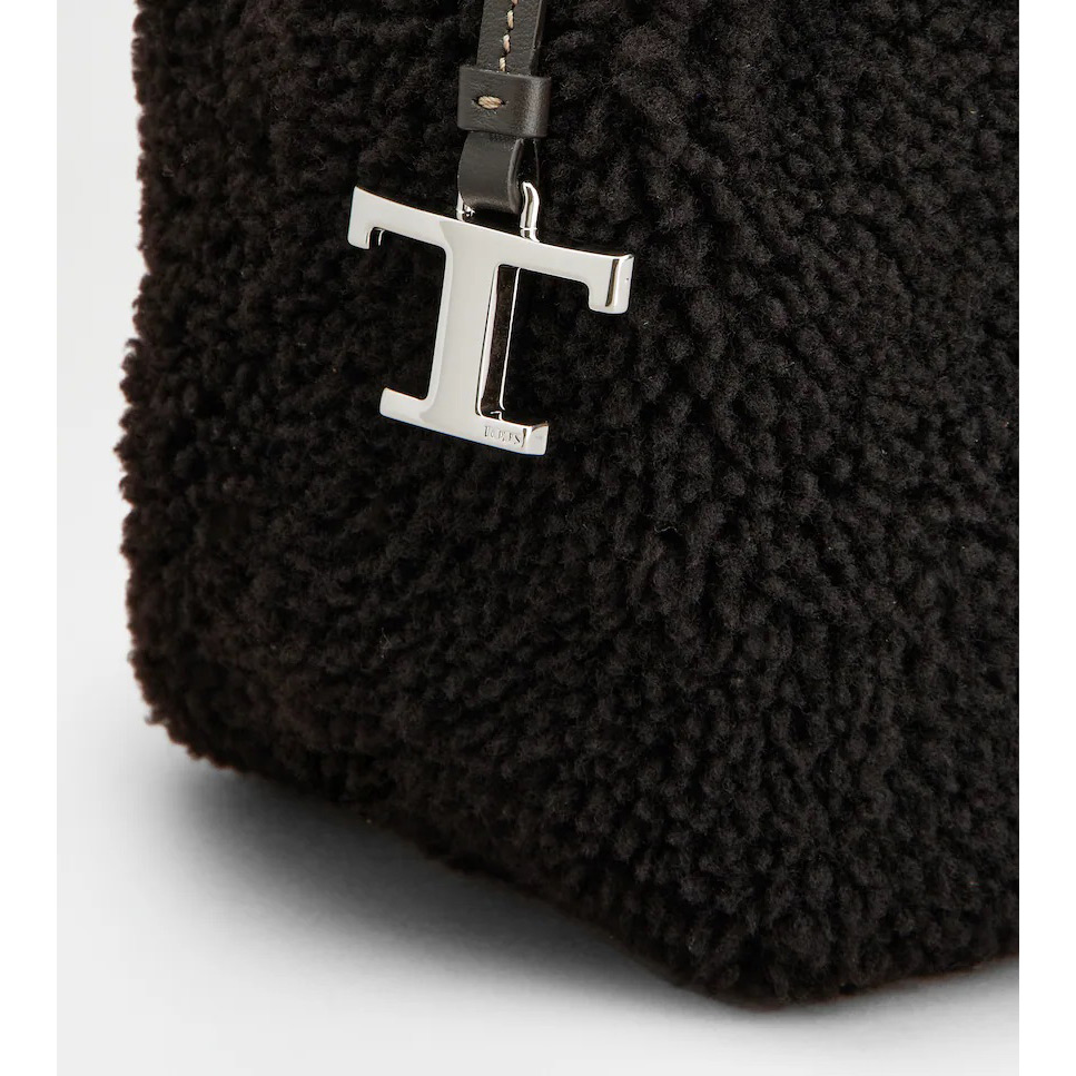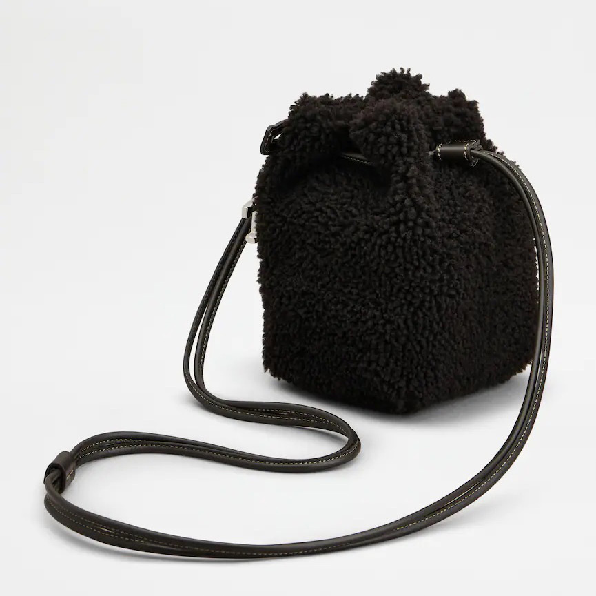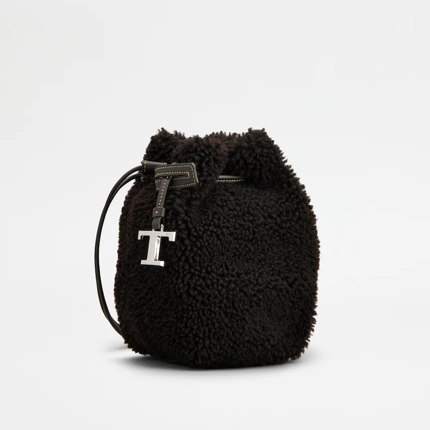 ソフトなシアリングのマイクロ バケットバッグ。アイコニックな T タイムレス ペンダント、ドローストリングになるチューブ状のレザーショルダーストラップを合わせた、上品でオールラウンドなウィンターモデルです。