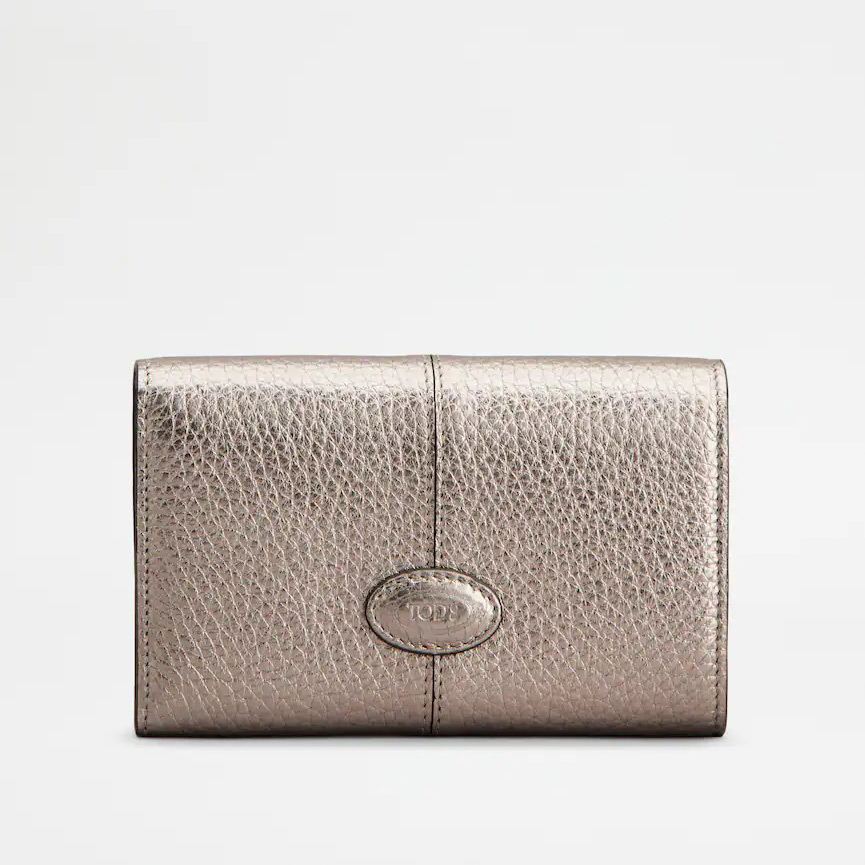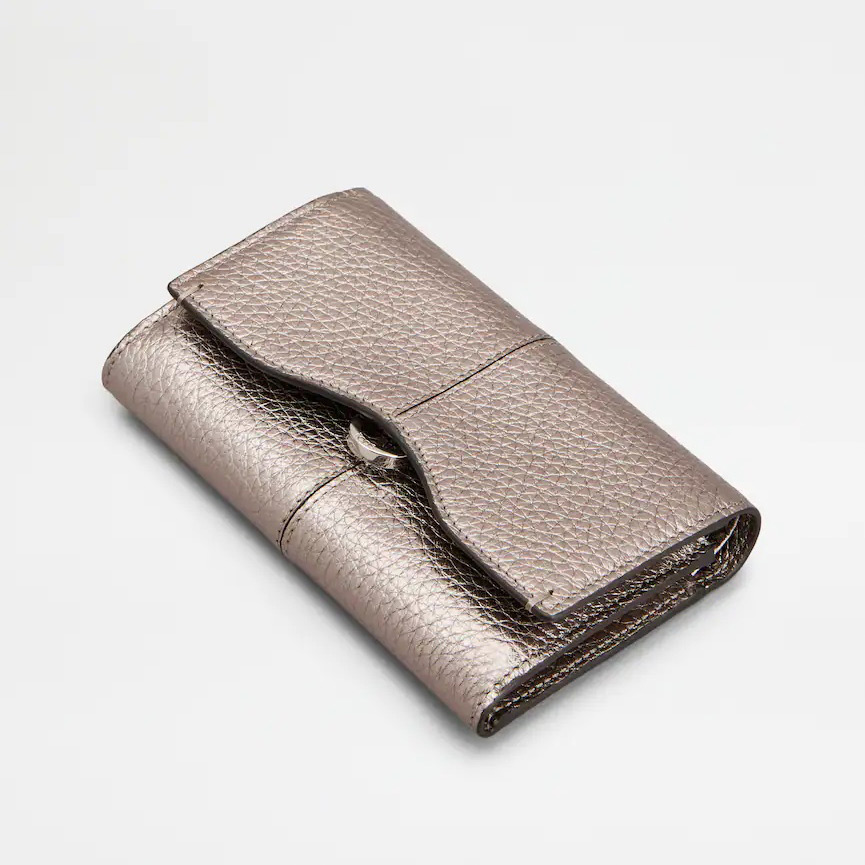 ラミネート仕上げが映える、グレインカーフレザーのウォレット。カーブを描くフラップ、トッズ Di バッグ スウィングから着想を得たメタル リング、アイコニックなセンターシームが特徴的です。ファスナー付きのコイン ポケット、スナップで閉じるコンパートメント、内側に札入れ、2つのフラット ポケット、カードスロットを合わせました。