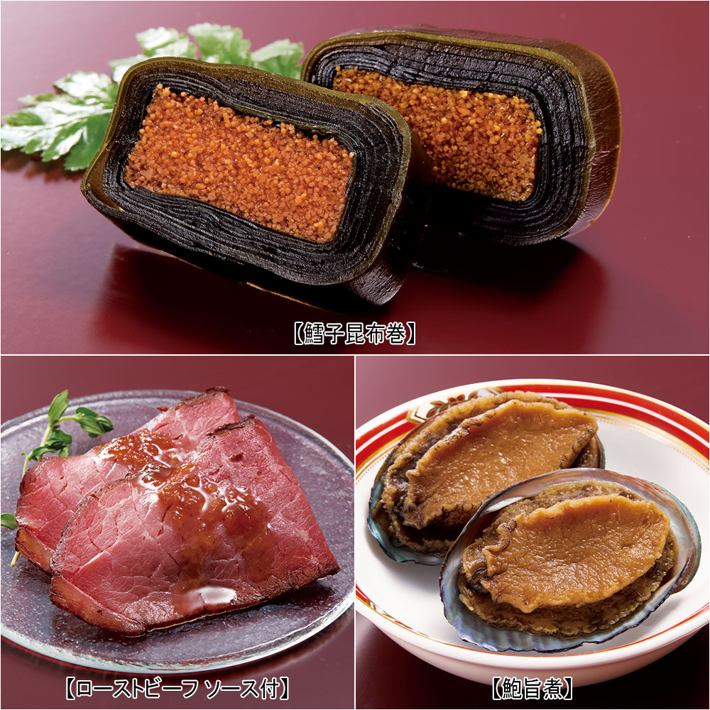 (一の重)かに信田、蛸旨煮、鮎土佐煮、市松かまぼこ、赤魚西京焼、はじかみ、伊達巻、梅麩含め煮、椎茸旨煮、牛しぐれ笹包み、金柑、鱈子昆布巻、祝海老、なます いくら添え、鶏肉八幡巻、梅型寒天、黒豆、栗金団