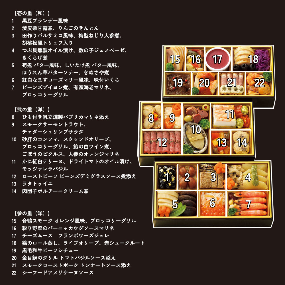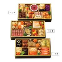 【冷凍便でお届けします。解凍まで時間がかかりますのでご注意ください。】「数の子ジェノベーゼ」「黒豆ブランデー風味」など、洋テイストを加味した和のおせち一段と、洋風の料理やオードブルを多彩に詰め合わせた二段。ワインやビールとともにご堪能ください。【一の重】伝統的な和の祝い肴を中心に、洋テイストにアレンジした黒豆、数の子、紅白なます、田作りなどを加えました。【二の重】「鮑の白ワイン煮」「肉団子ポルチーニクリーム煮」「かに紅白テリーヌ」など、ひと味違う洋風料理を。【三の重】「合鴨スモーク オレンジ風味」や「黒毛和牛ビーフシチュー」「金目鯛のグリル トマトバジルソース添え」など多彩な洋食メニュー。※オンラインストア・タカシマヤ通信販売のみの承りとなります。(高島屋各店でのお取り扱いはございません。)