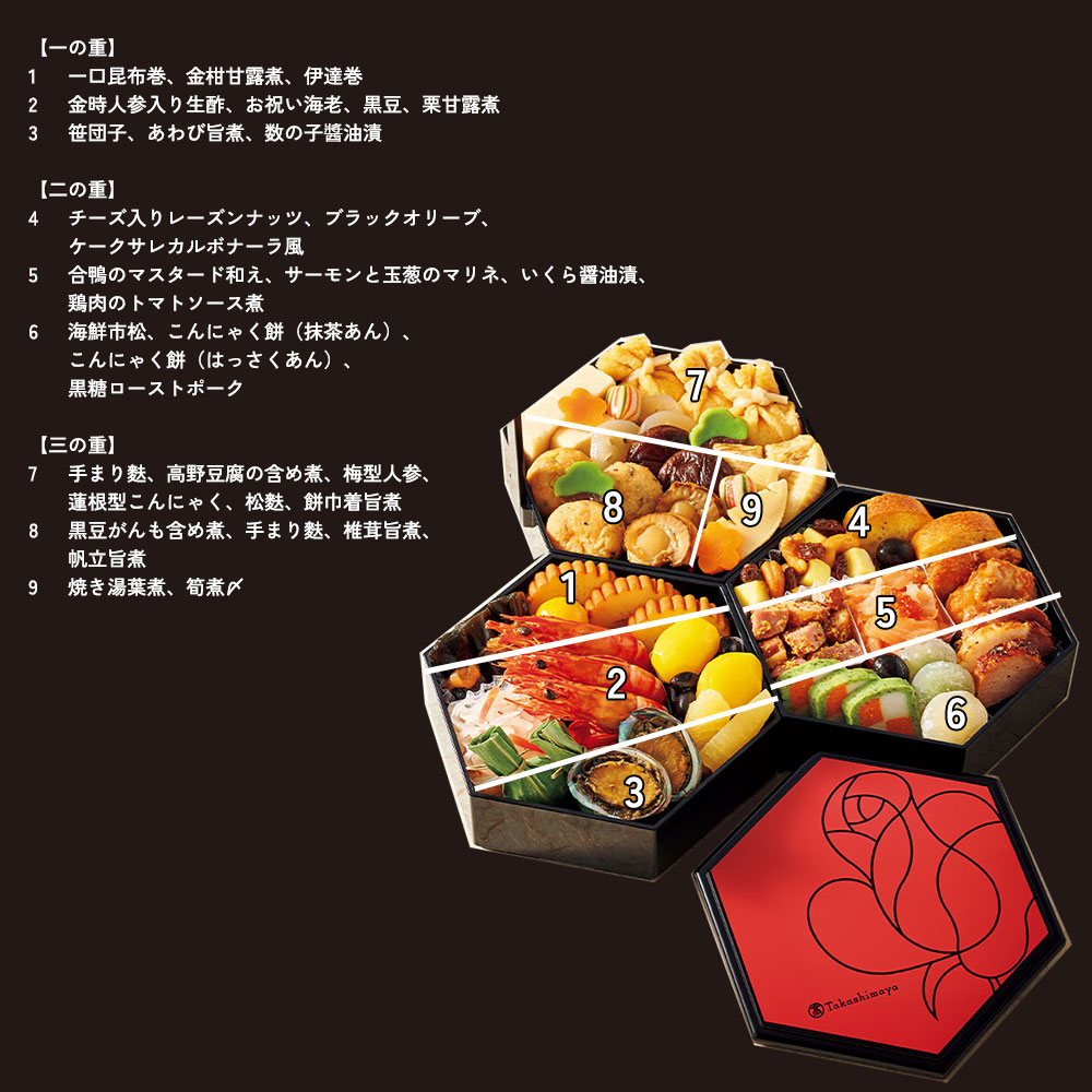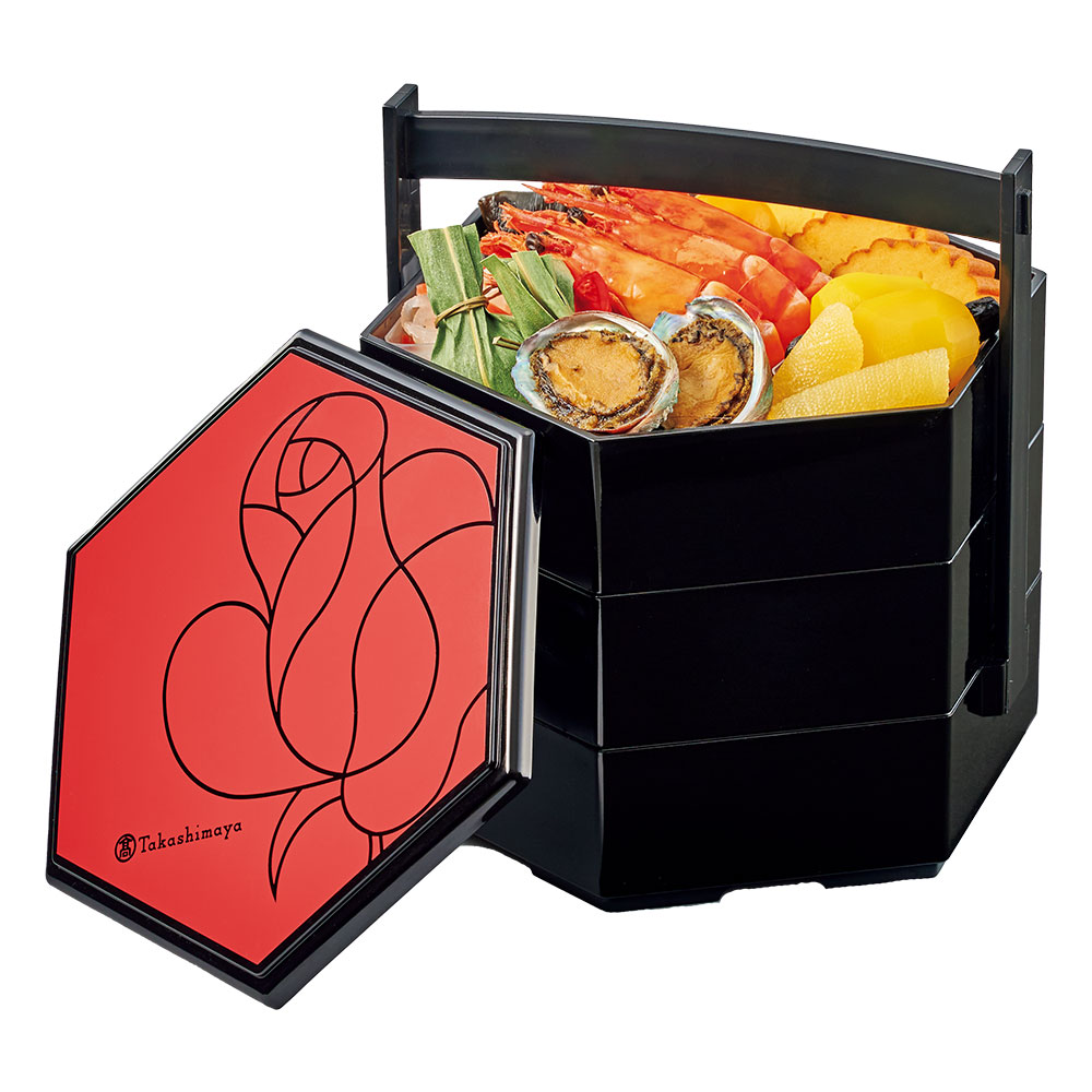 【冷凍便でお届けします。解凍まで時間がかかりますのでご注意ください。】素材をいかし、丁寧に調理した色とりどりの京料理に加え、洋風の食材も多く盛り込みました。蓋の絵柄が毎年変わる山中塗の三段重「八坂の組」。今年はモダンなバラの線描画です。昨年タカシマヤ通信販売で人気No.4のおせちです。(※2024年9月-2024年12月までのタカシマヤ通信販売「おせち料理」の売上順位に基づきます。)※オンラインストア・タカシマヤ通信販売のみの承りとなります。(高島屋各店でのお取り扱いはございません。)