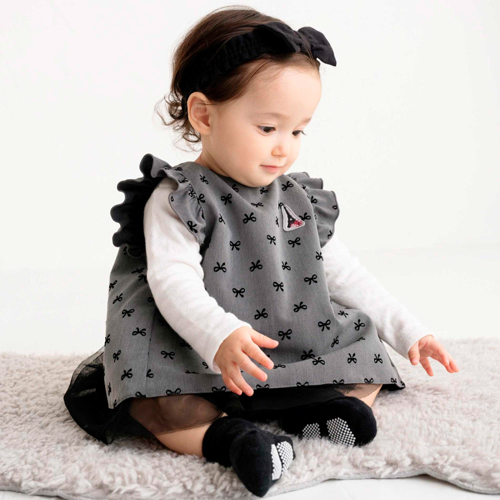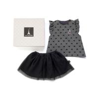 グレーにリボンのフロッキープリント。胸元には、エッフェル塔のワッペンがポイントです。セットのチュールスカートを合わせると、スタイなのにキュートで上品なコーデが出来上がり。