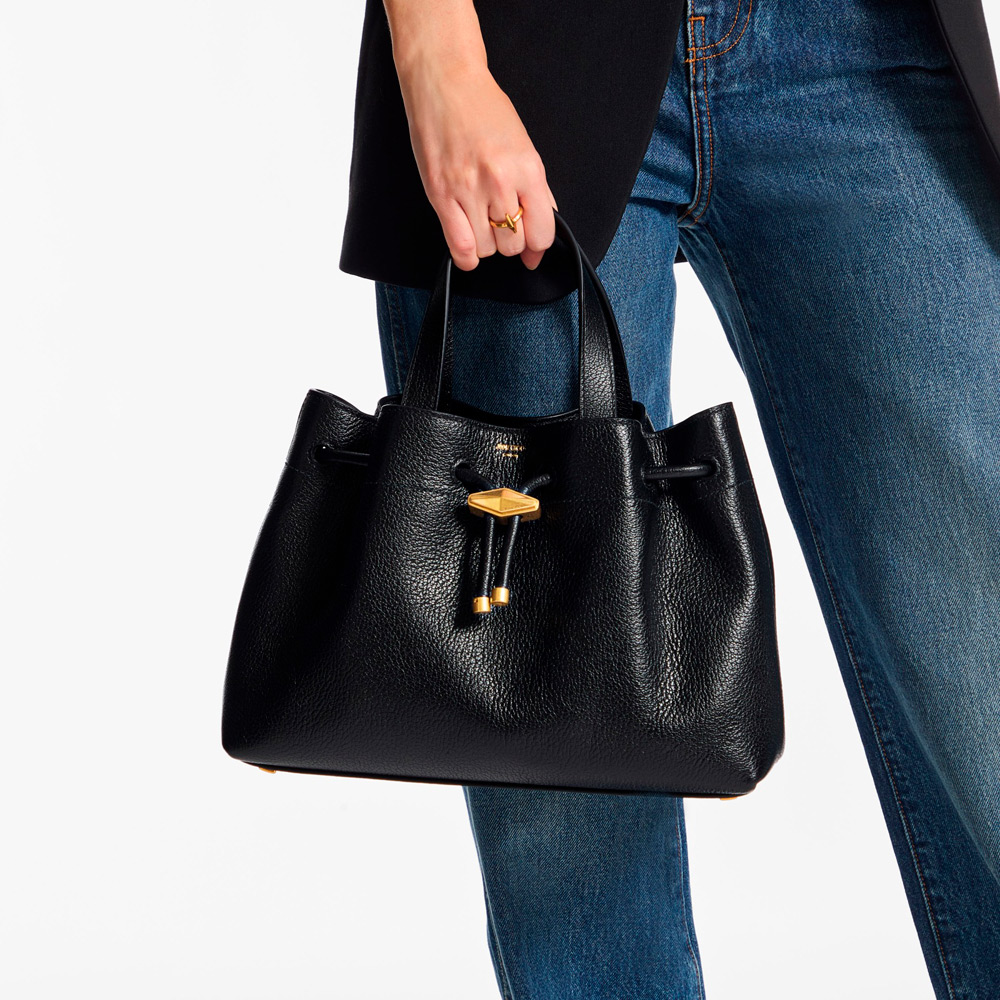 しなやかなグレインカーフレザーを使用したシンチ トート。「くびれた」ドローストリングクロージャーとハイブリッドなスタイリングを可能にするトップハンドルが特徴です。そのエフォートレスなシルエットは、ドローストリングのクロージャーとゴールドトーンのハードウェアとのコントラストを生み出します。