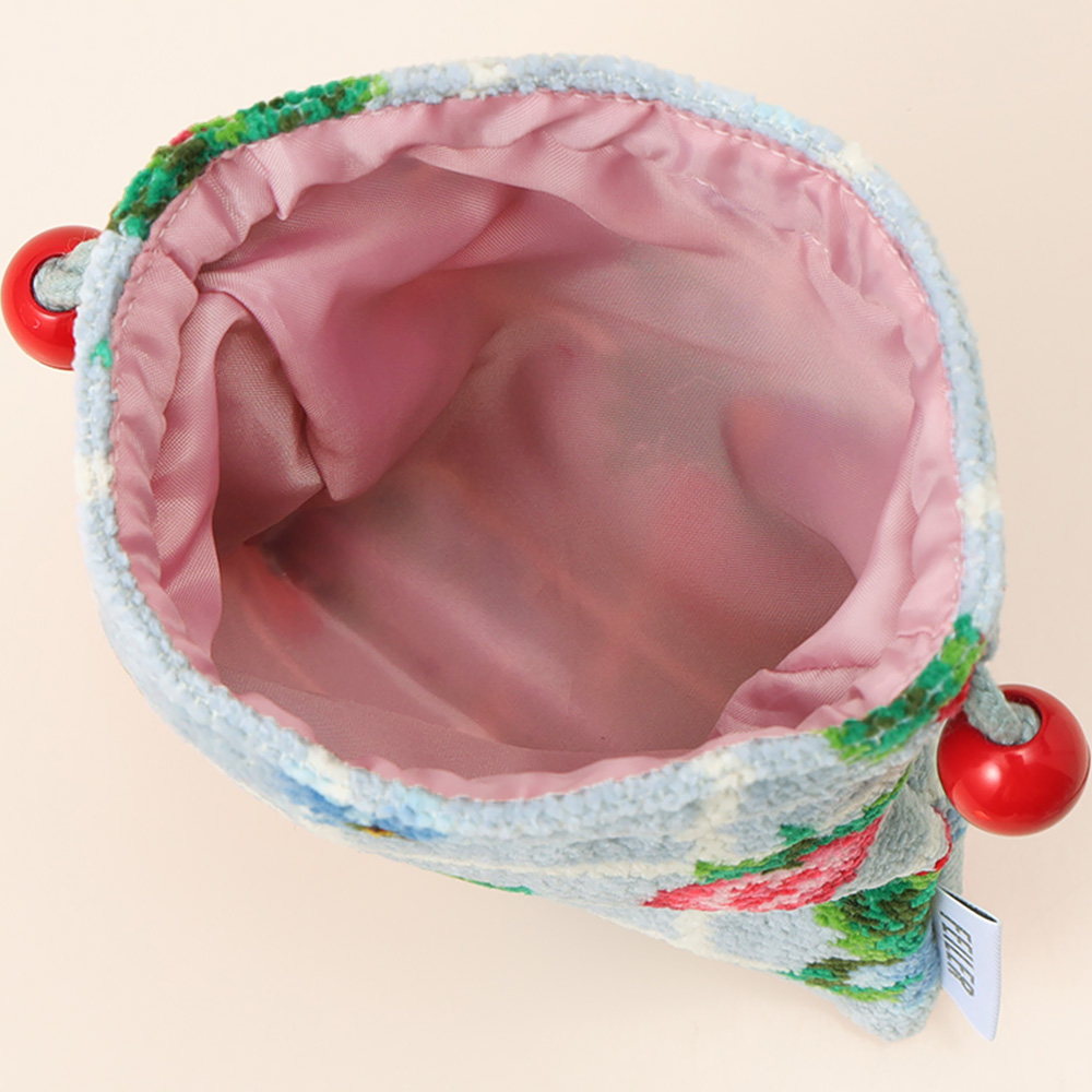 コロンと小ぶりで可愛いサイズ感の巾着です。絆創膏や飴のような小さなお菓子、小ぶりのモバイルバッテリーなど細々したものを入れて持ち運ぶのに便利なサイズ感です。ハンカチプラスワンのギフトにも大変お勧めです。※苺の束が入ります。
