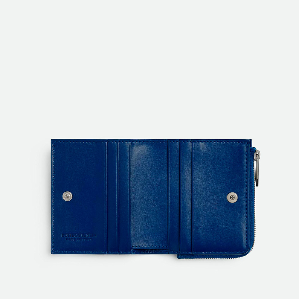 イントレチャート柄のエンボス加工が施された、カーフレザーの二つ折りウォレットです。