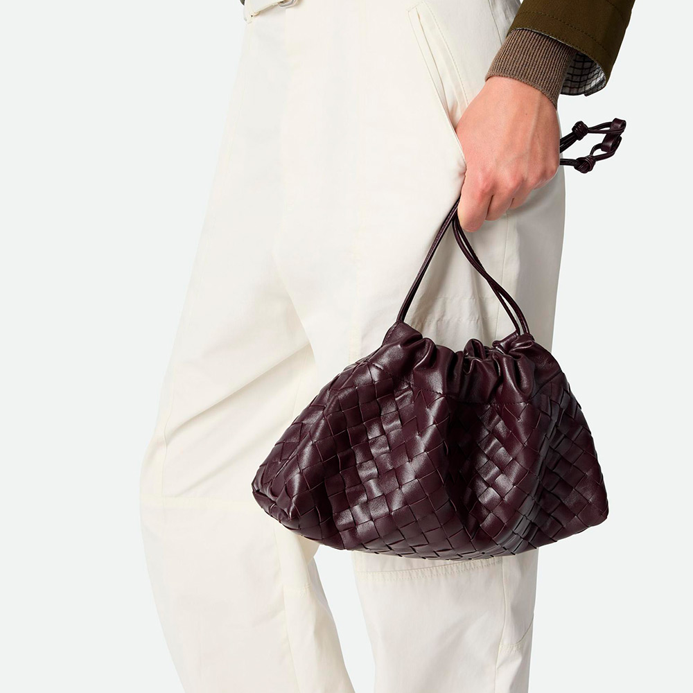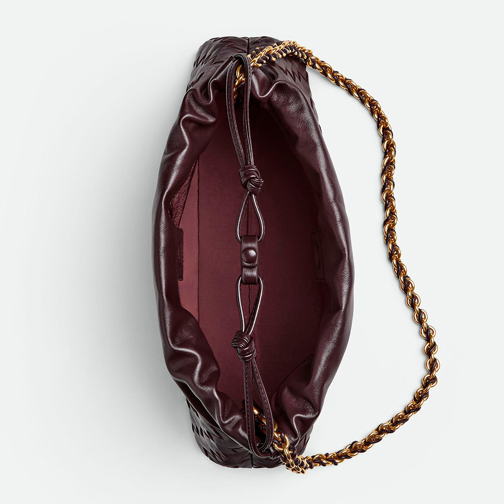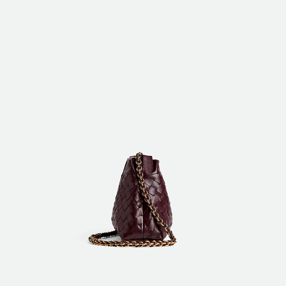 レザーチューブとメタルのブレイドチェーンが付いた、イントレチャートカーフレザーのダストバッグです。ドローストリングクロージャーにショルダーバッグとして使えるループが付いています。