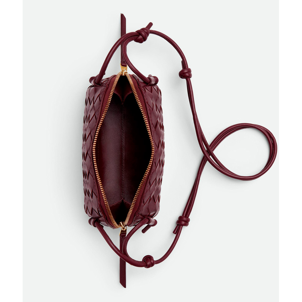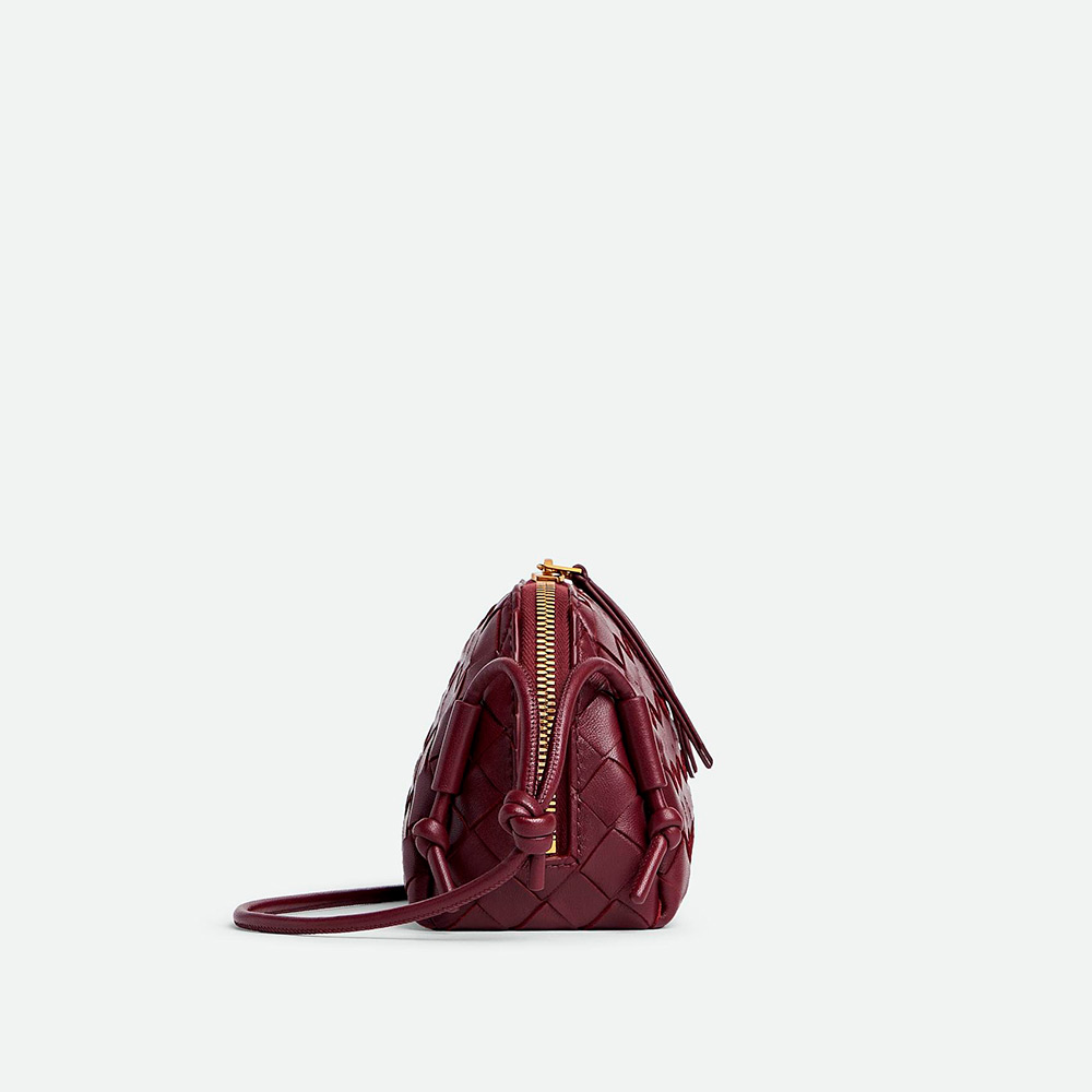 長さの調節可能なチューブ状のストラップとスライド式ノットディテールが付いた、イントレチャートナッパレザーのポーチです。