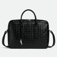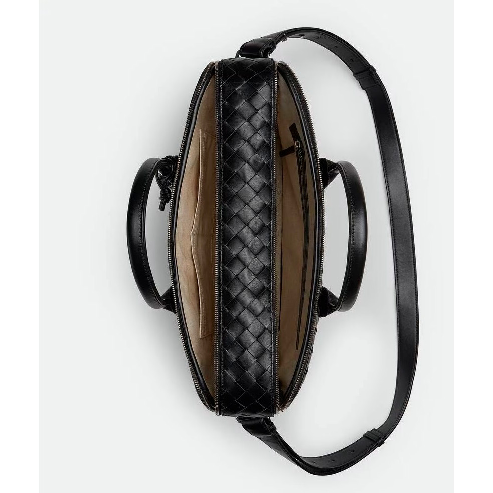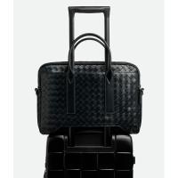 調節と取り外し可能なストラップとアイコニックなノットディテールが付いた、ソフトなイントレチャートレザーのブリーフケースです。