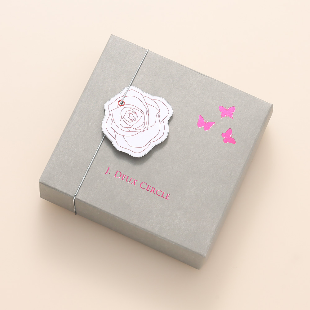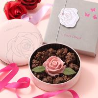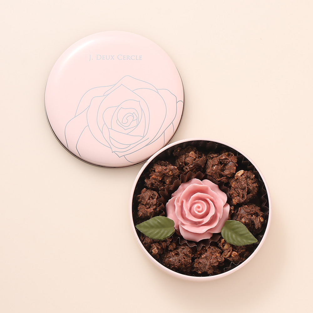 可憐なローズはフランス産のチョコレートを使用し、ベリーのフレッシュで甘酸っぱい、ひと口で心ときめく味わいに仕立てました。その周りを囲むのは、ラングドシャを練り込んだサクサク軽やかなチョコクランチ。深みのあるシックな色合いと上品な佇まいがローズの華やかさを一層引き立てます。