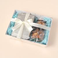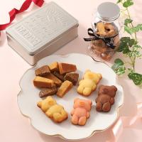 <くまのフィナンシェ>感謝のメッセージ入りパッケージに入ったくまさんのフィナンシェ。いちご、バニラ、ショコラ、メイプルの4種類の味をお洒落なブリキ缶に詰め合せました。<バウムラスク(くまボトル)>テディベアのボトルには、当店人気のバウムクーヘンを食べやすい大きさにカットして乾燥焼きにした、素朴なラスクを詰めています。