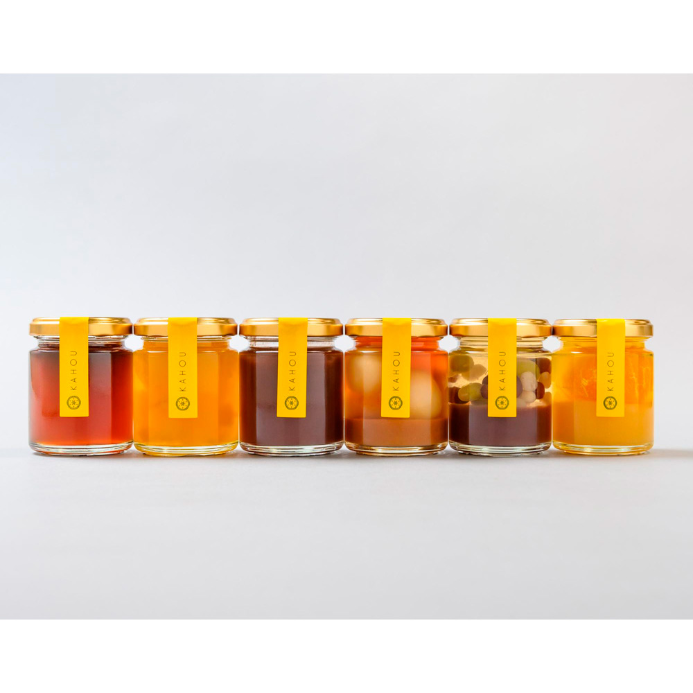 6種の瓶入りスイーツ(みたらし団子&きなこ羊羹、温州蜜柑ゼリー、かのこ&餡わらび、水羊羹、マンゴーピーチジュレ、わらびもち)と米粉の最中種に発酵バター、キャラメルテイストの琥珀生地に3種のナッツをトッピングした燦樂の詰め合わせです。季節のご挨拶、節目の贈りものに贈る方贈られた方の笑顔をつなぐ果朋-KAHOU-のギフト。