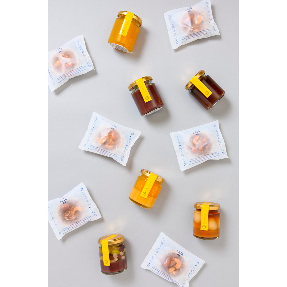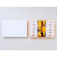 6種の瓶入りスイーツ(みたらし団子&きなこ羊羹、温州蜜柑ゼリー、かのこ&餡わらび、水羊羹、マンゴーピーチジュレ、わらびもち)と米粉の最中種に発酵バター、キャラメルテイストの琥珀生地に3種のナッツをトッピングした燦樂の詰め合わせです。季節のご挨拶、節目の贈りものに贈る方贈られた方の笑顔をつなぐ果朋-KAHOU-のギフト。
