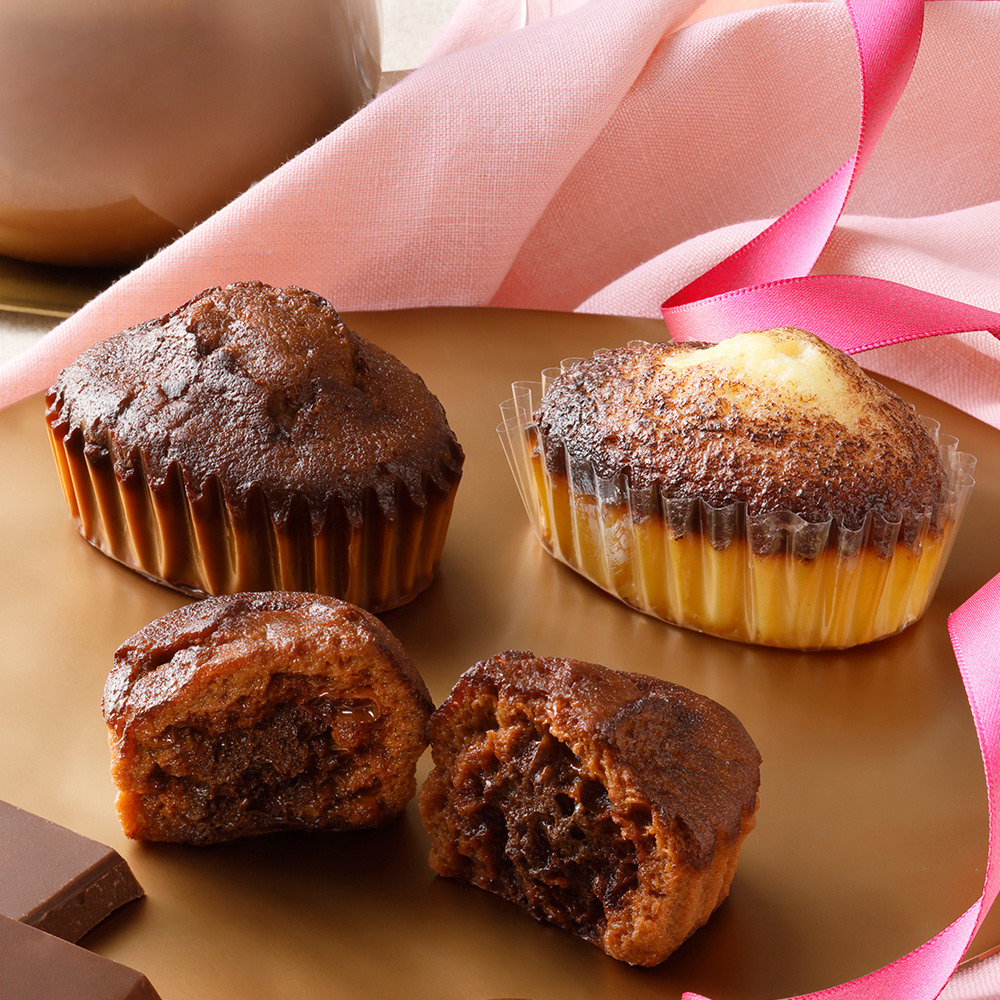 <焼きティラミスショコラ>2種類のチョコレートパウダーと北海道産のマスカルポーネを練りこんだ生地を焼き上げ、チョコレートソースを注入。じゅわっと染み出すチョコレートソースとカカオの豊かな風味が口いっぱいに広がります。<焼きティラミス>ティラミスを、しっとり、ふんわりの焼き菓子にしました。こだわりの北海道産マスカルポーネチーズと北海道産小麦を使用したスポンジに、ほろ苦いコーヒーシロップを一つ一つていねいに染み込ませました。