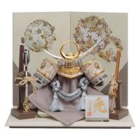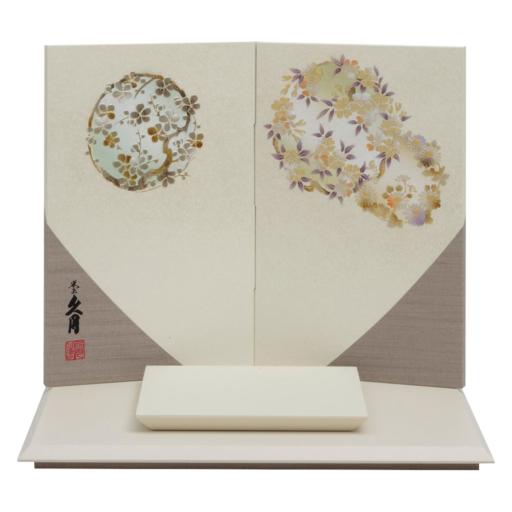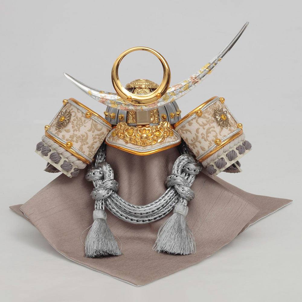 様々な花輪のモチーフが描かれた優しい風合いの屏風に、彫金の美しい兜を合わせた一品。