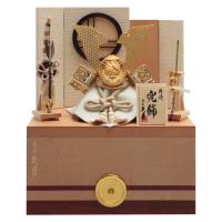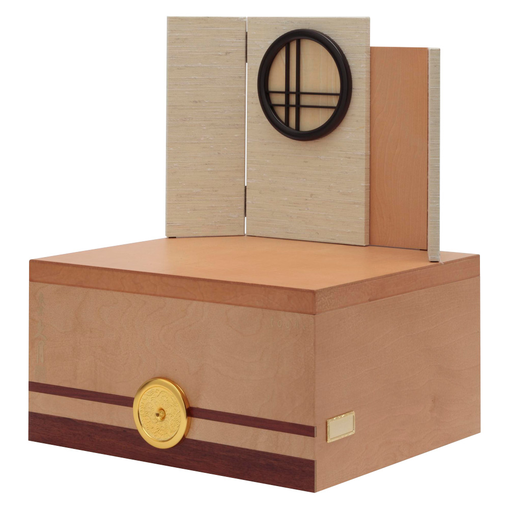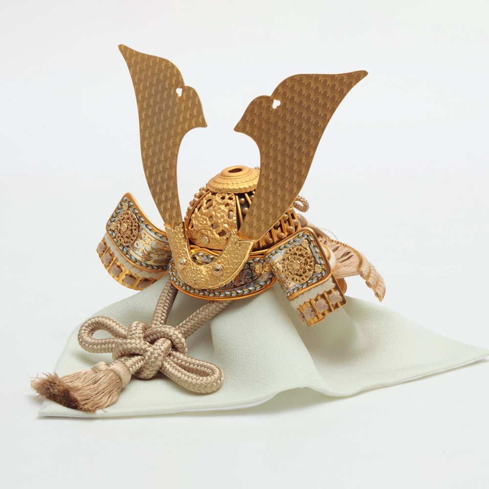 高級感のある煌びやかな雰囲気が魅力の兜を、優しく美しい木肌が素敵な栃を使用した飾り台と屏風に合わせました。