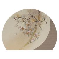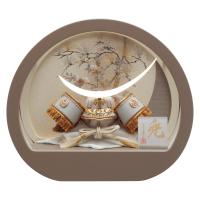 人気のモカ色で仕立てたモダンなデザインの円形アクリルケースが、明るく煌びやかな三日月前立の兜を一層引き立てます。