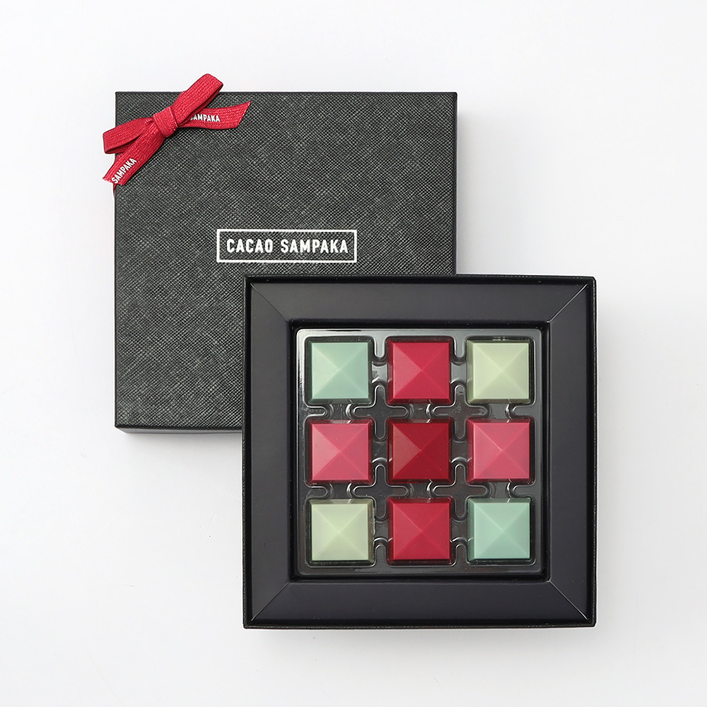 宝石のようなフォルムと鮮やかな彩りに、フルーツのみずみずしい味わいをお楽しみいただける煌めくセンセーションなボンボンチョコレートの詰め合せ。<粒紹介>ココ イ ピニャ:ココナッツとパイナップルを練りこんだ南国の香り漂うガナッシュをホワイトチョコレートでコーティング。ピスターチョ ペタセタ:ピスタチオペーストに、口の中の水分と反応してパチパチ音がするペタセタ入り。リマ:爽やかな酸味が心地よいライムのガナッシュをホワイトチョコレートでコーティング。ロサ:ローズ風味のガナッシュをローズカラーのホワイトチョコレートでコーティング。フランブエサ:ラズベリーの甘酸っぱいガナッシュを真っ赤なホワイトチョコレートでコーティング。