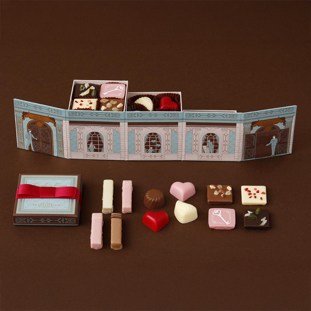 キャレショコラ:ストロベリー・ミルク・ホワイト・スイート 各1個、ブシェショコラ:ヘーゼルナッツ・ストロベリー・紅茶・ラズベリー 各1個、バトンショコラ:ストロベリー 2個、塩キャラメル・ピスタチオ 各1個 計12個