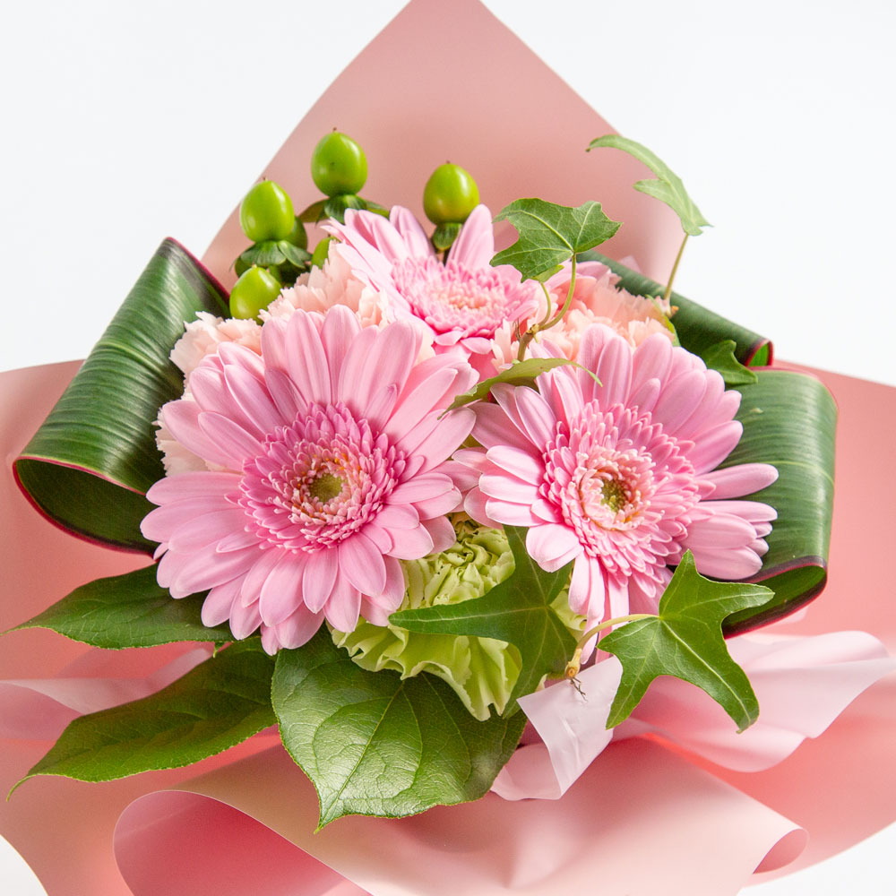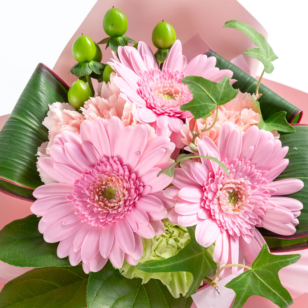 ガーベラ、カーネーション、ヒペリカム、グリーン