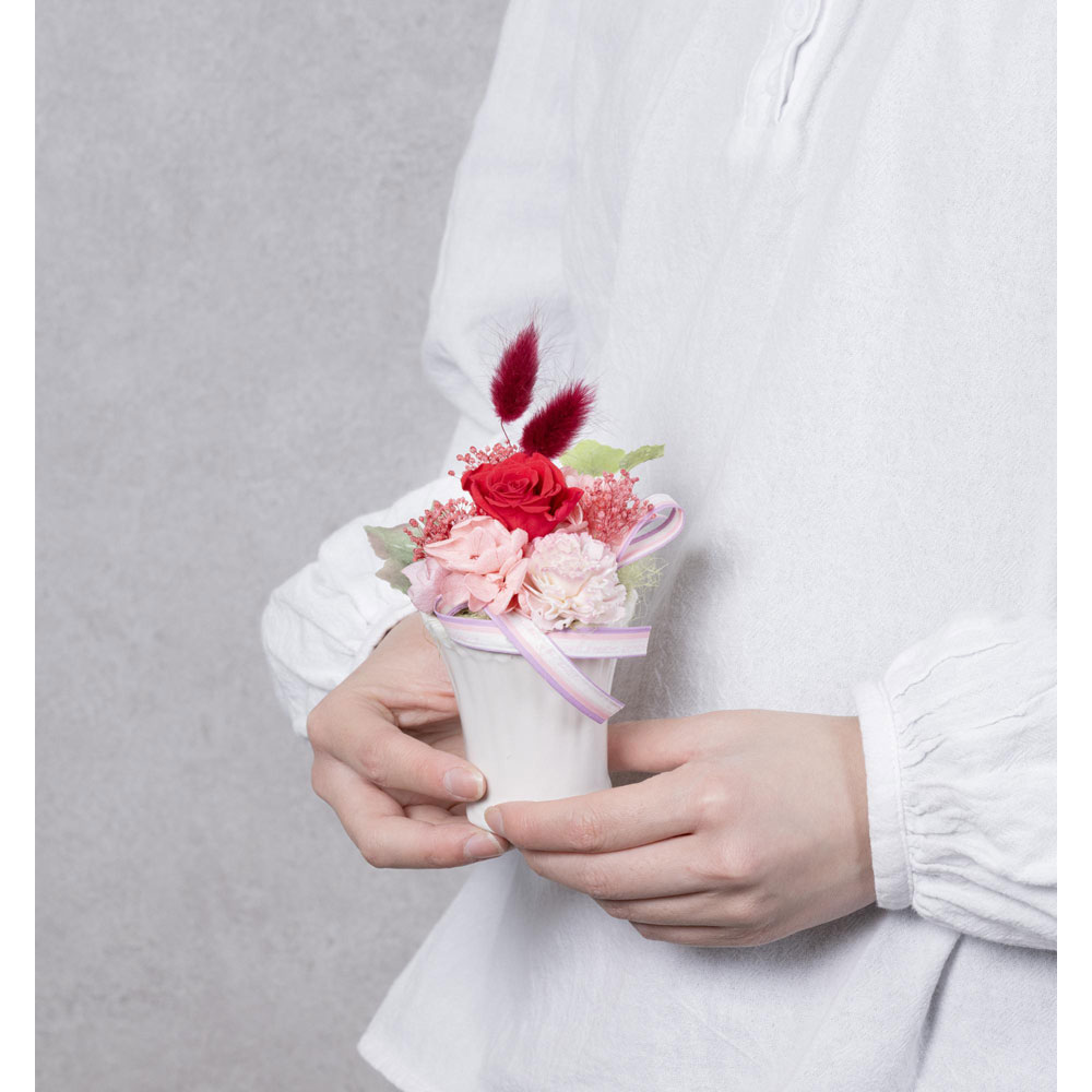 ※<プリザーブドフラワーとは>プリザーブド(preserved)とは保存の意味、生花の水分を抜き取り特殊な保存液に置き換える特殊加工で、咲いた状態のお花を長時間保ったものです。見た目はみずみずしいのに枯れることのない花。水やりの必要はございません。高温多湿を避けてお楽しみください。