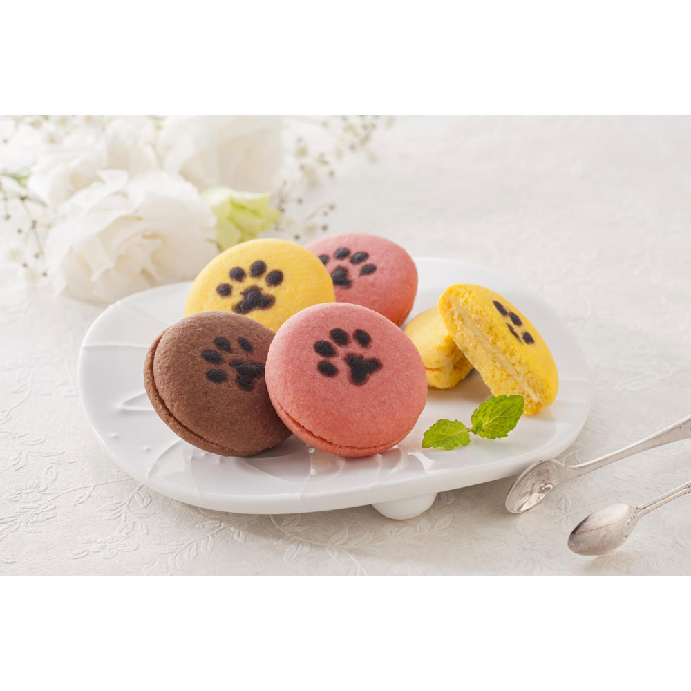 ネコの可愛らしい肉球の焼き印がついた、ころんとしたサンドクッキーです。いちご、チーズ、ココアのクッキーにホワイトチョコクリームをサンドしました。