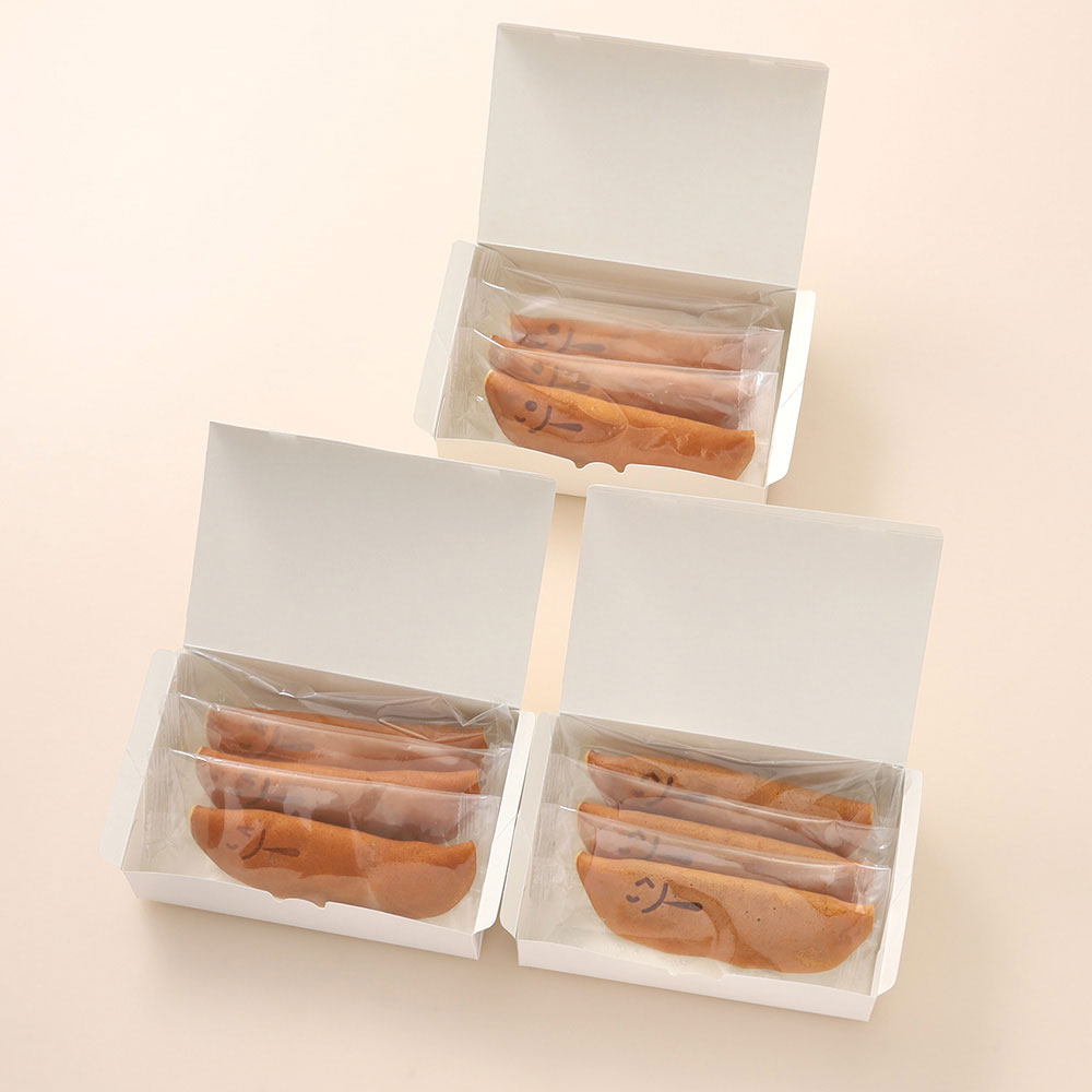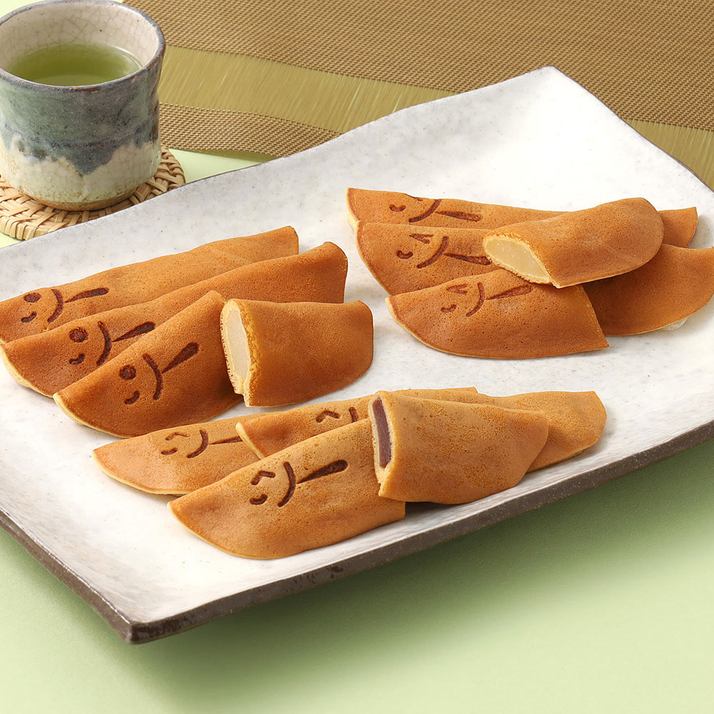清流をいきいきと泳ぐ鮎の姿をかたどったお菓子。ふくやの「あゆ」は3種類もあり三者三様の美味しさをご堪能いただけます。また焼印で表す表情も「ハッピーで楽しい」をテーマに3種類ご用意しました。若あゆ(求肥):オーソドックスながらもむっちりした特製生地とコシのある求肥の相性が絶妙です。塩あゆ(ようかん):ほどよく効いた生地の塩味とようかんのしっかりした甘さがマッチした一品です。塩あゆ(レモン求肥):求肥にしっかり練りこまれたレモンピールと生地の程よい塩味の組合せで爽やかな美味しさです。