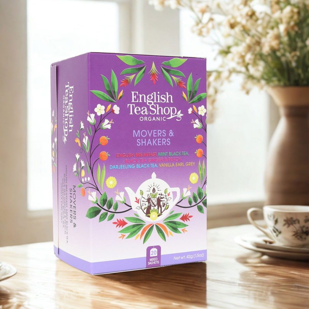 18世紀のイギリスの紅茶屋さんを舞台に、人々の暮らしやティータイムの風景を描いた「ティーハウス缶」。表には優雅に紅茶を楽しむ紳士淑女、裏面にはバックヤードで働く女性や、ロッキングチェアでくつろぐ老人など、当時の穏やかな日常が丁寧に表現されています。眺めるたびに物語が広がる、ノスタルジックなデザイン缶です。「ムーバーズ&シェイカーズ」は、English Tea Shopの代表的なフレーバーを一度に楽しめるハイライト的なアソート。イングリッシュブレックファストの凛としたコク、ミントブラックティーの清涼感、ジンジャーウィズピーチの華やかな香り、レモンブラックティーの爽快感、バニラアールグレイの甘く上品な余韻と、個性豊かな味わいがバランスよく揃っています。その日の気分やシーンに合わせて選ぶ楽しさがあり、初めてお試しいただく方にも、日常的に愛飲される方にも満足度の高いアソート。英国の世界観に浸りながら、多彩なオーガニックティーを味わえる特別なティーセットです。